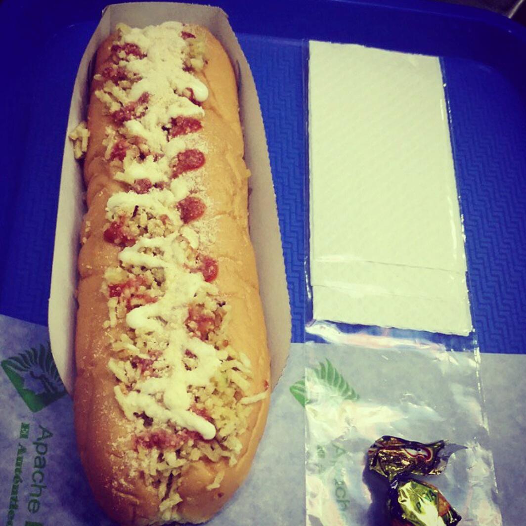 Salchicha con queso parmesano, cebolla y salsas al gusto