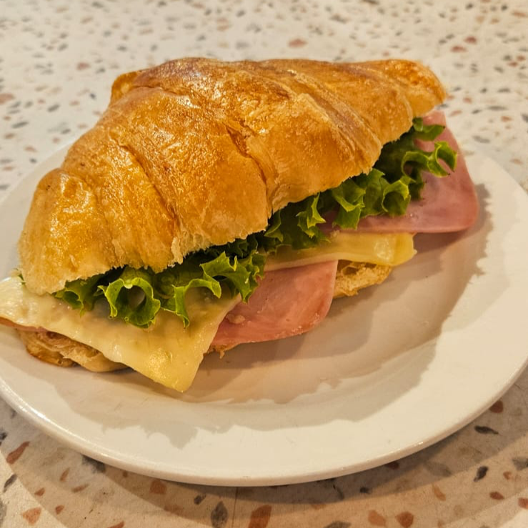Croissant relleno: Huevo, Tocineta, Queso doblecrema, Jamón, Lechuga, Tomate y tartara