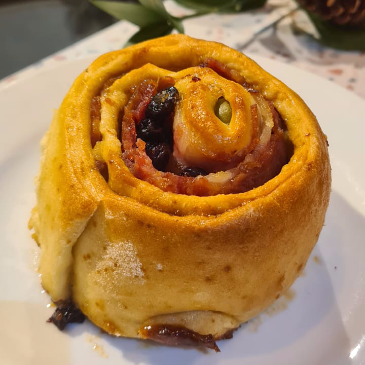 Rollo de Pan de jamón, jamon, tocineta, queso crema, aceitunas y uvas pasas