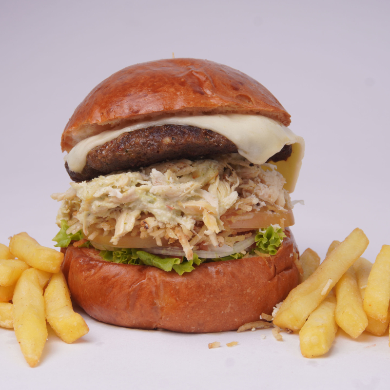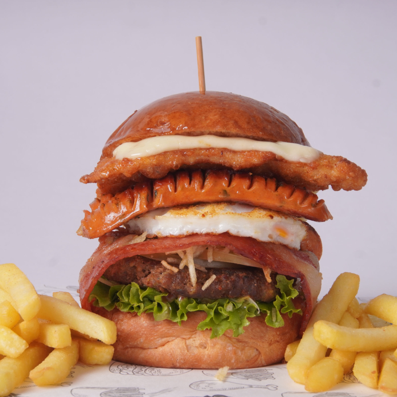 Pan semi brioche, Croqueta de Carne 100grs, croqueta de pechuga crispy,huevo frito, doble Tocineta ahumada, choriizo, Huevo de Codorniz,Queso doble crema, Salsa tartara, BBQ, Piña, vegetales fresco(lechuga,cebolla,tomate) + papas a la francesa