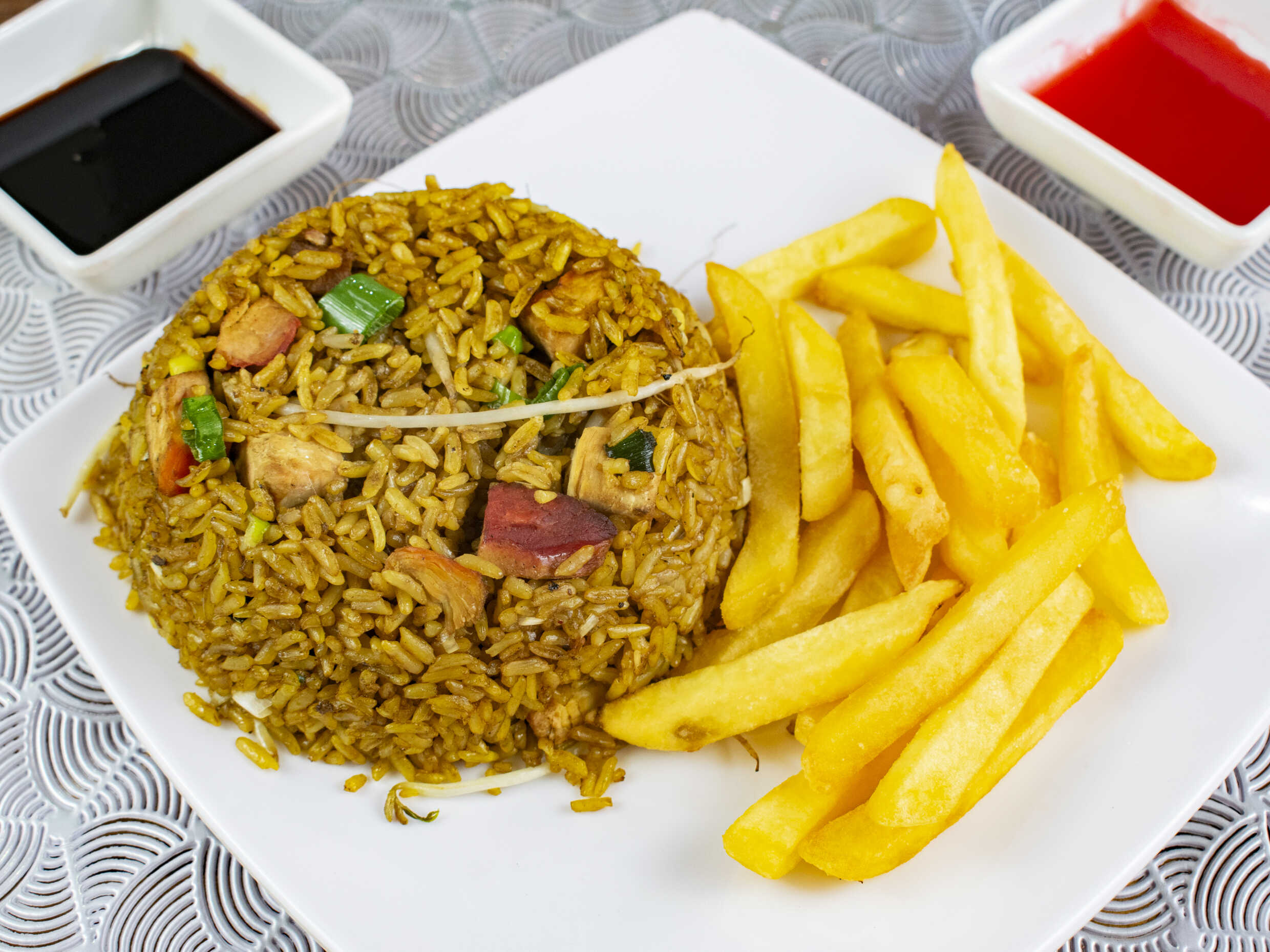 Arroz salteado al wok con jamón ahumado, cebollín y raíces + Papas a la francesa