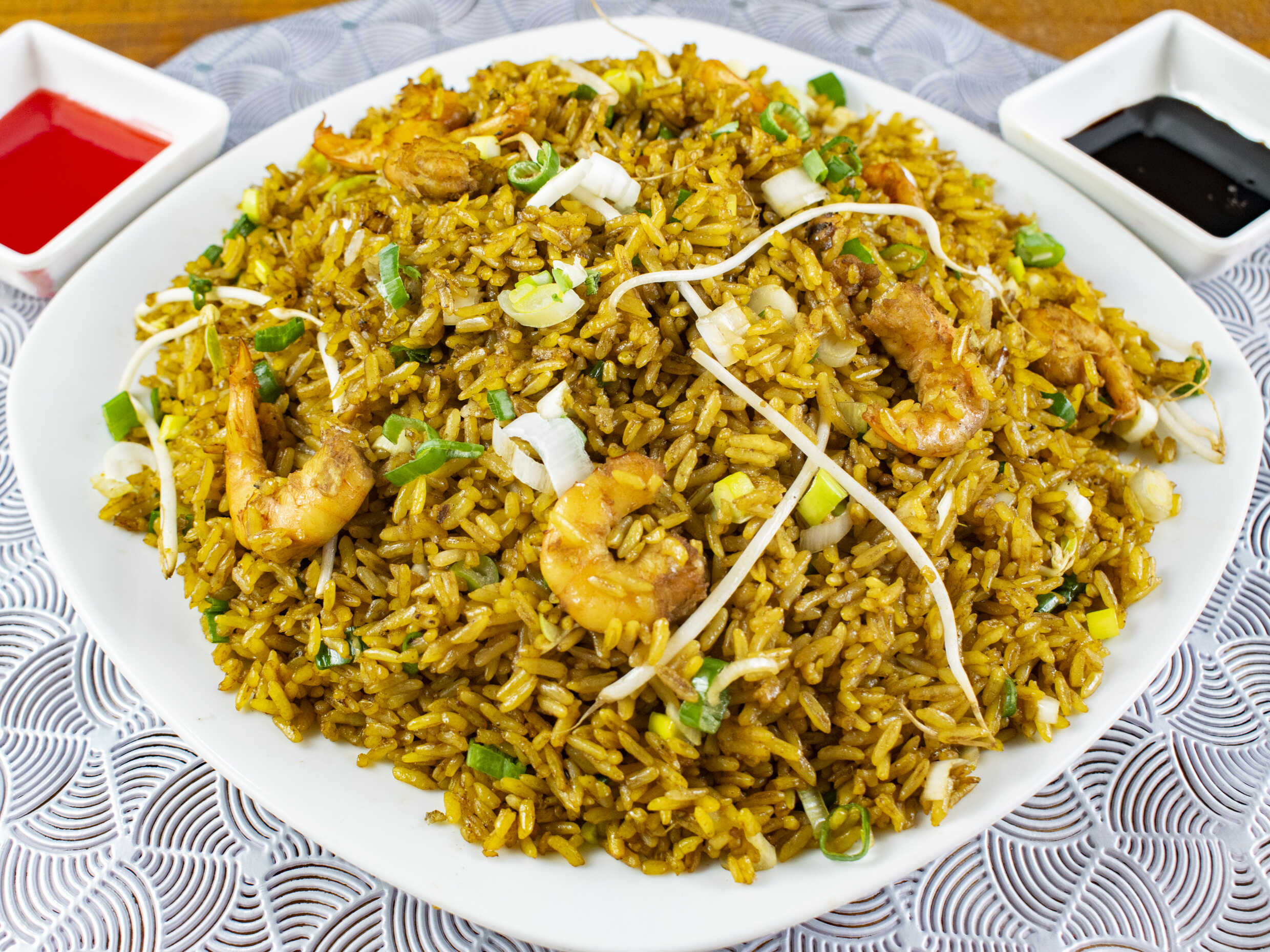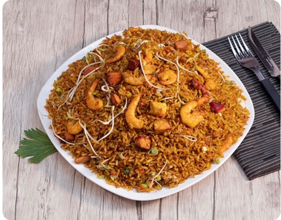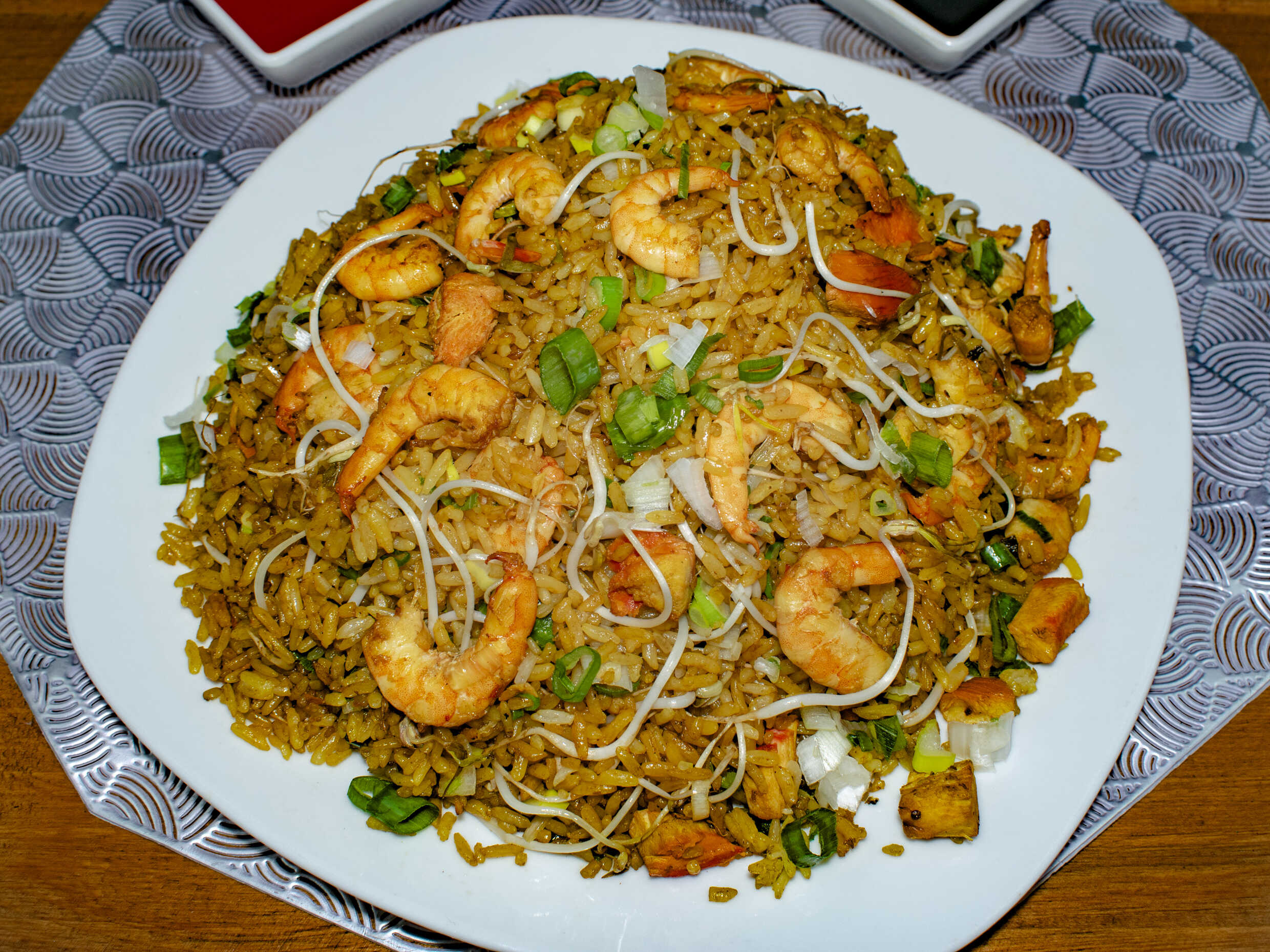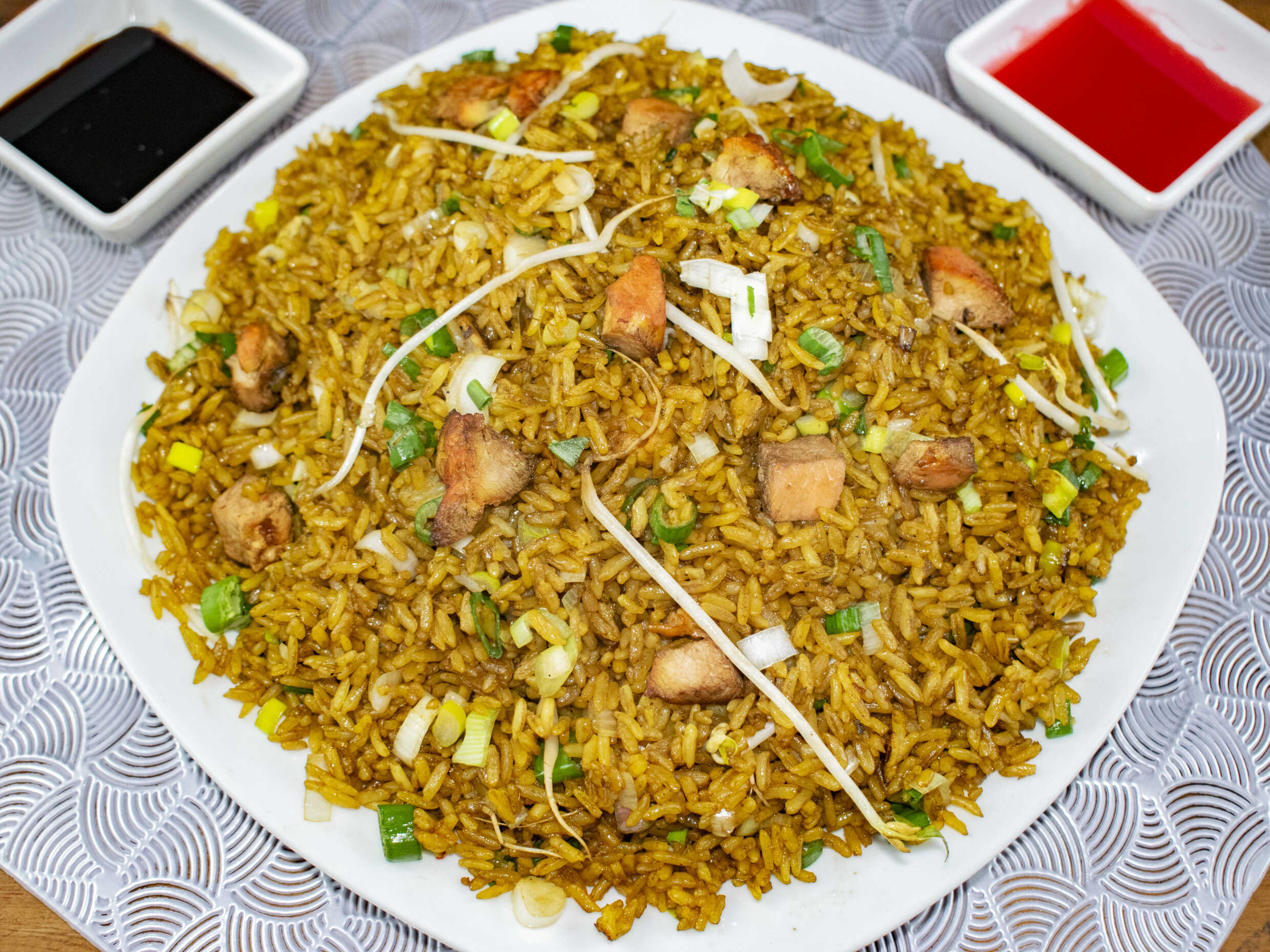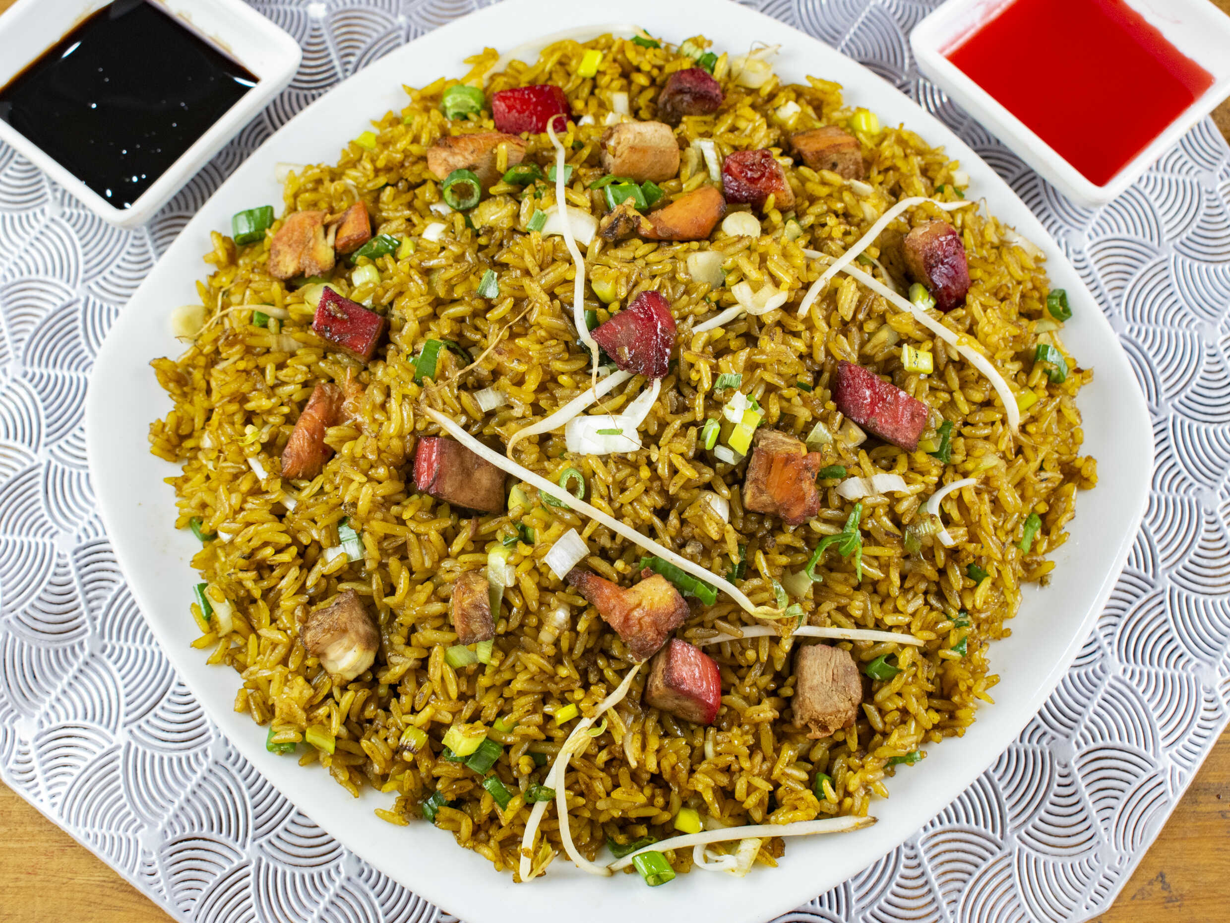 Arroz chino con jamón, pollo, cerdo, camarones,cebollín y raíces chinas.
