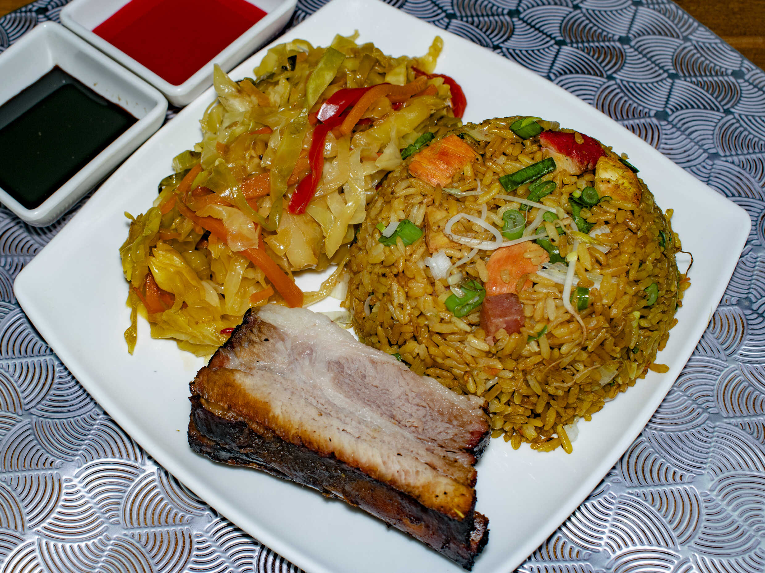 Arroz chino con jamón, cerdo, pollo, cebollín y raíces chinas