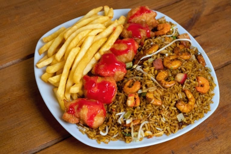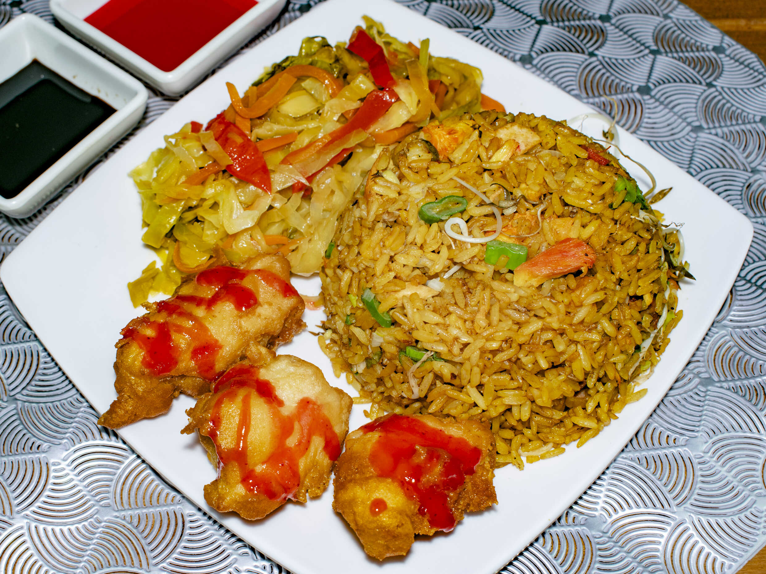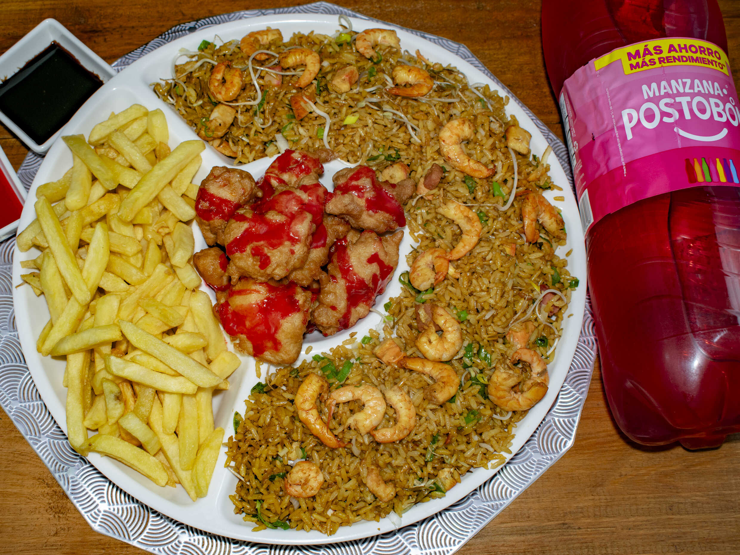 Arroz chino preparado con jamón, pollo, cerdo y camarones + 12 piezas de pollo agridulce + 1 servicio de papas a la francesa + 1 gaseosa