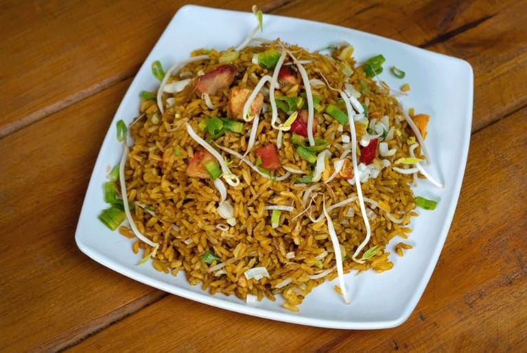 Arroz chino con cerdo, camarón, cebollín y raíces