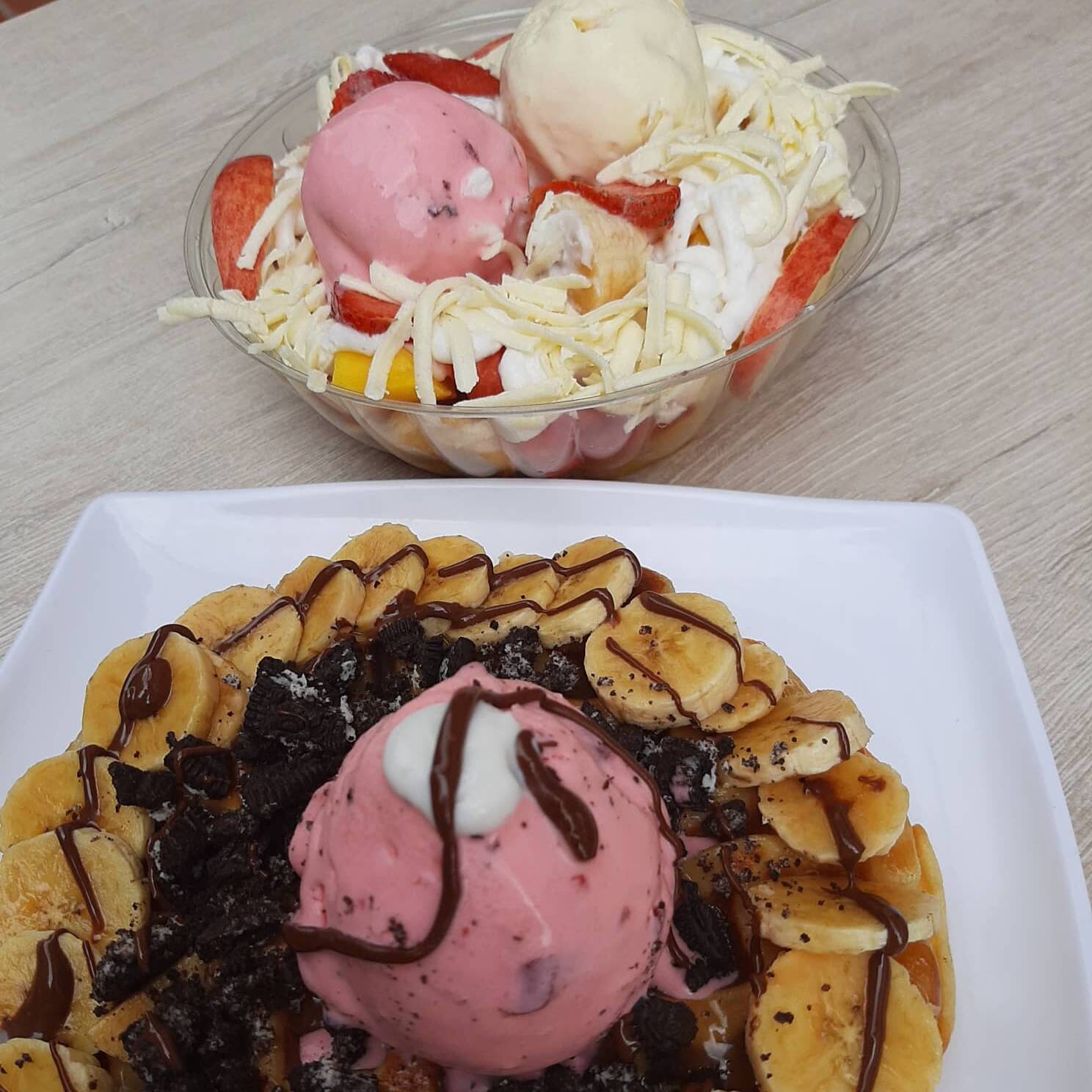 Waffle con fresa, papaya, banano, mango, helado y barquillos