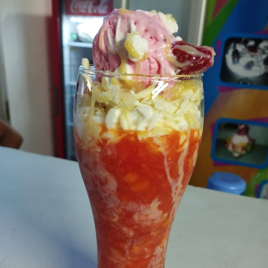 deliciosa ensalada de frutas con helado queso y crema chantilli, moñito y tarjeta