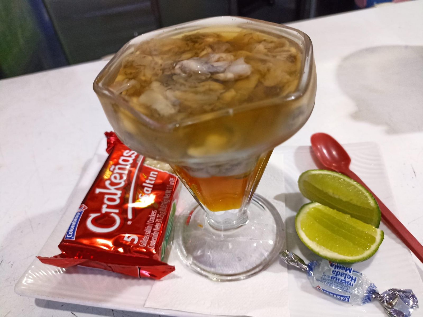Ostras en Brandy acompañadas con cebolla, limón y galletas saltín
