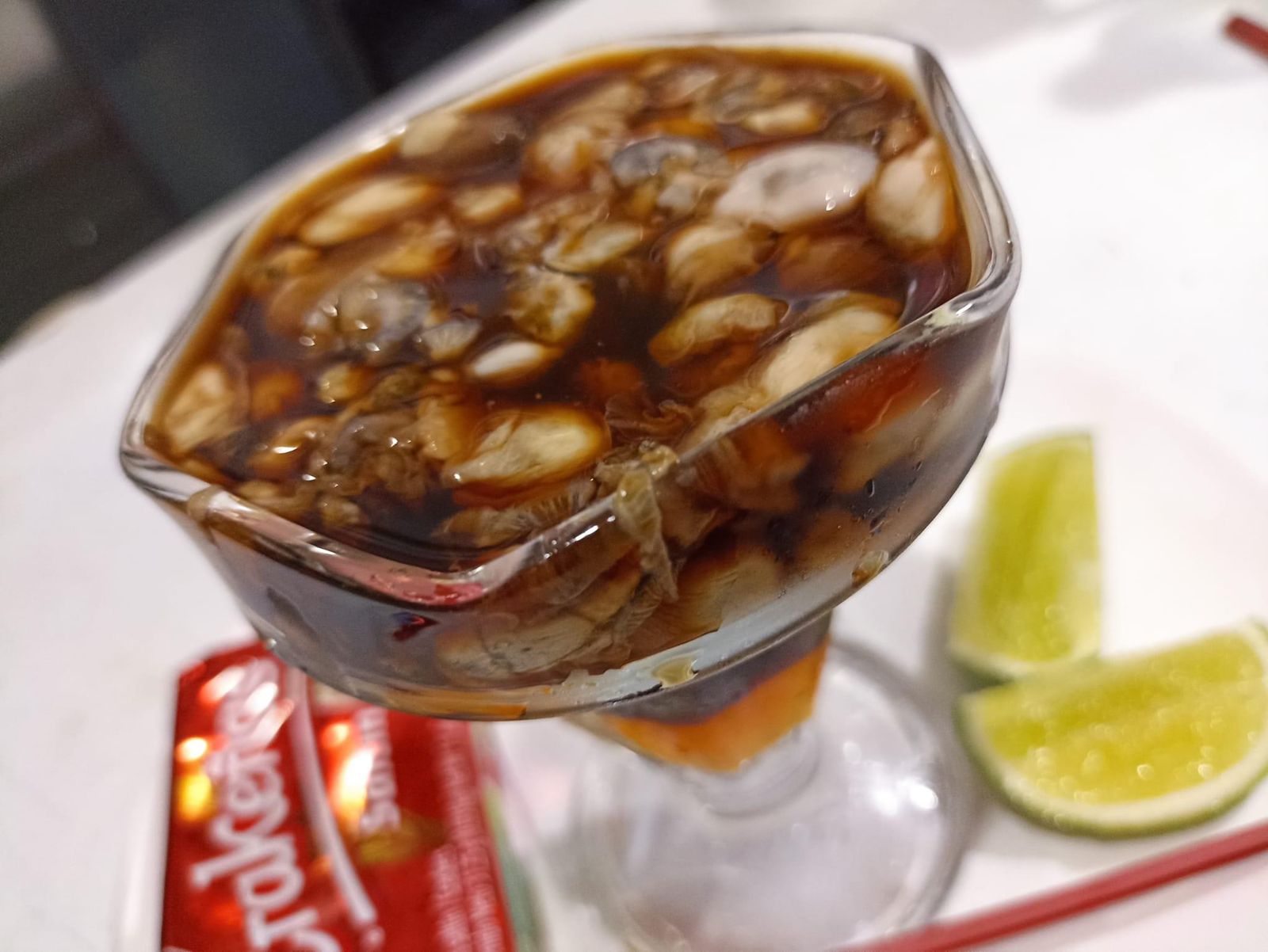 Ostras en salsa rosadaacompañado con cebolla y limón