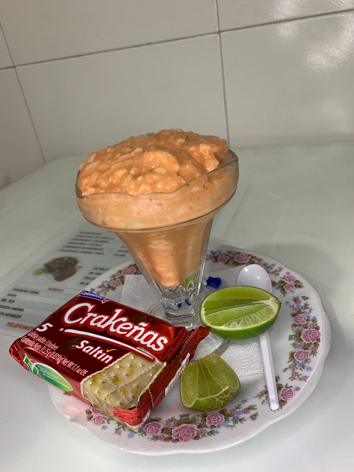 (vaso 9 oz) Coctel coctel de camarones sin cebolla en salsa rosada acompañado de galletas saltín