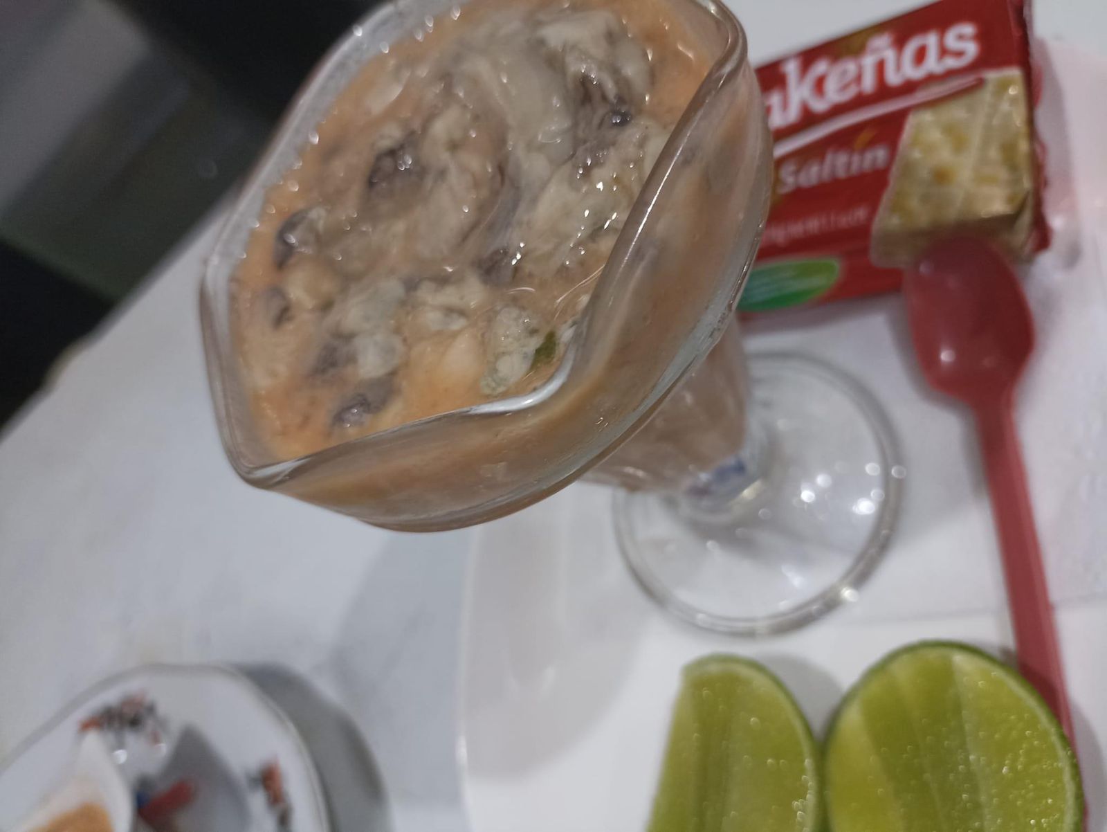 Coctel con camarones y Ostras acompañado de cebolla salsa rosada y galletas saltín