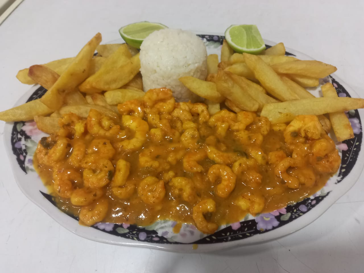 Contiene ccamarón, calamar y palmito demar acompañada de papas a la francesa o patacones