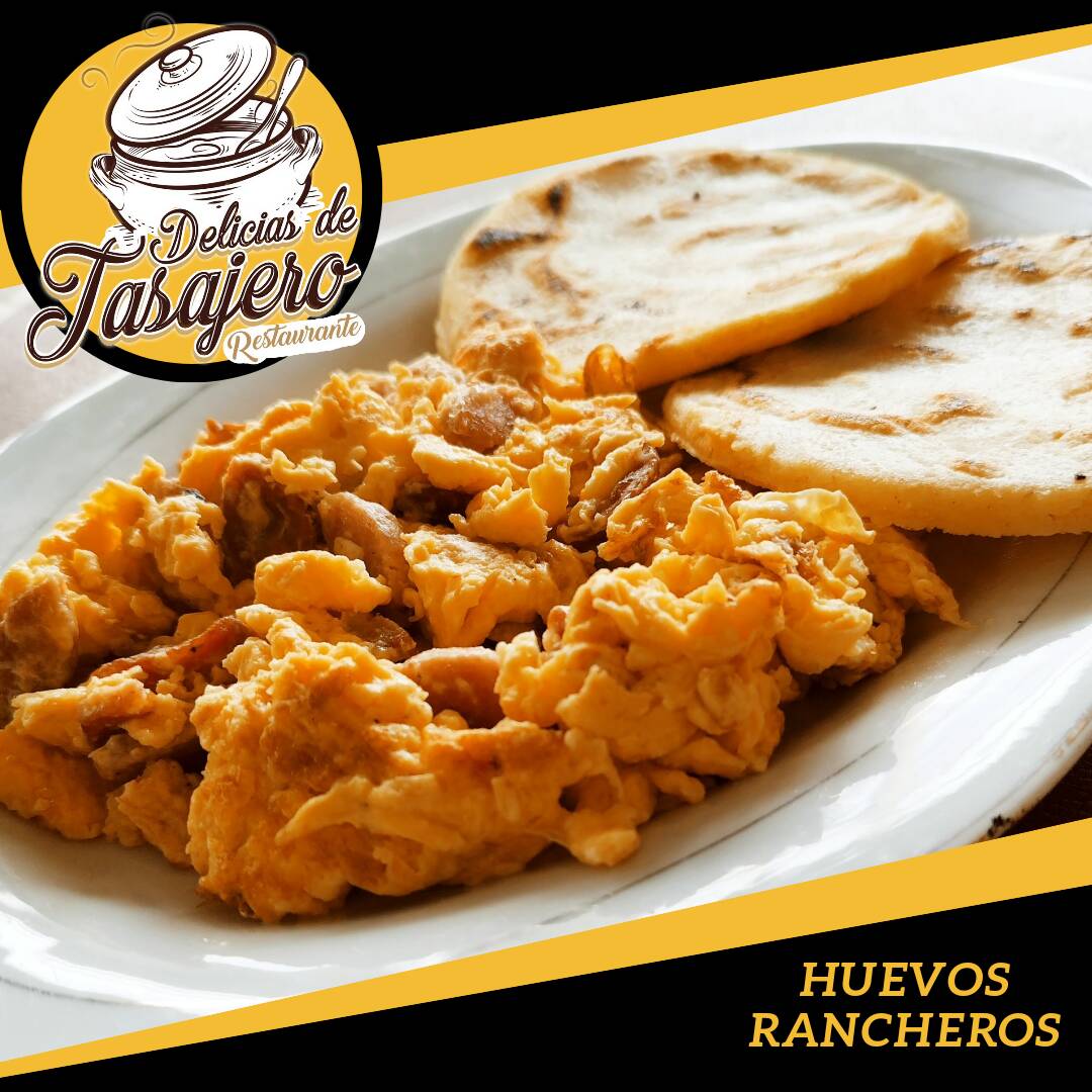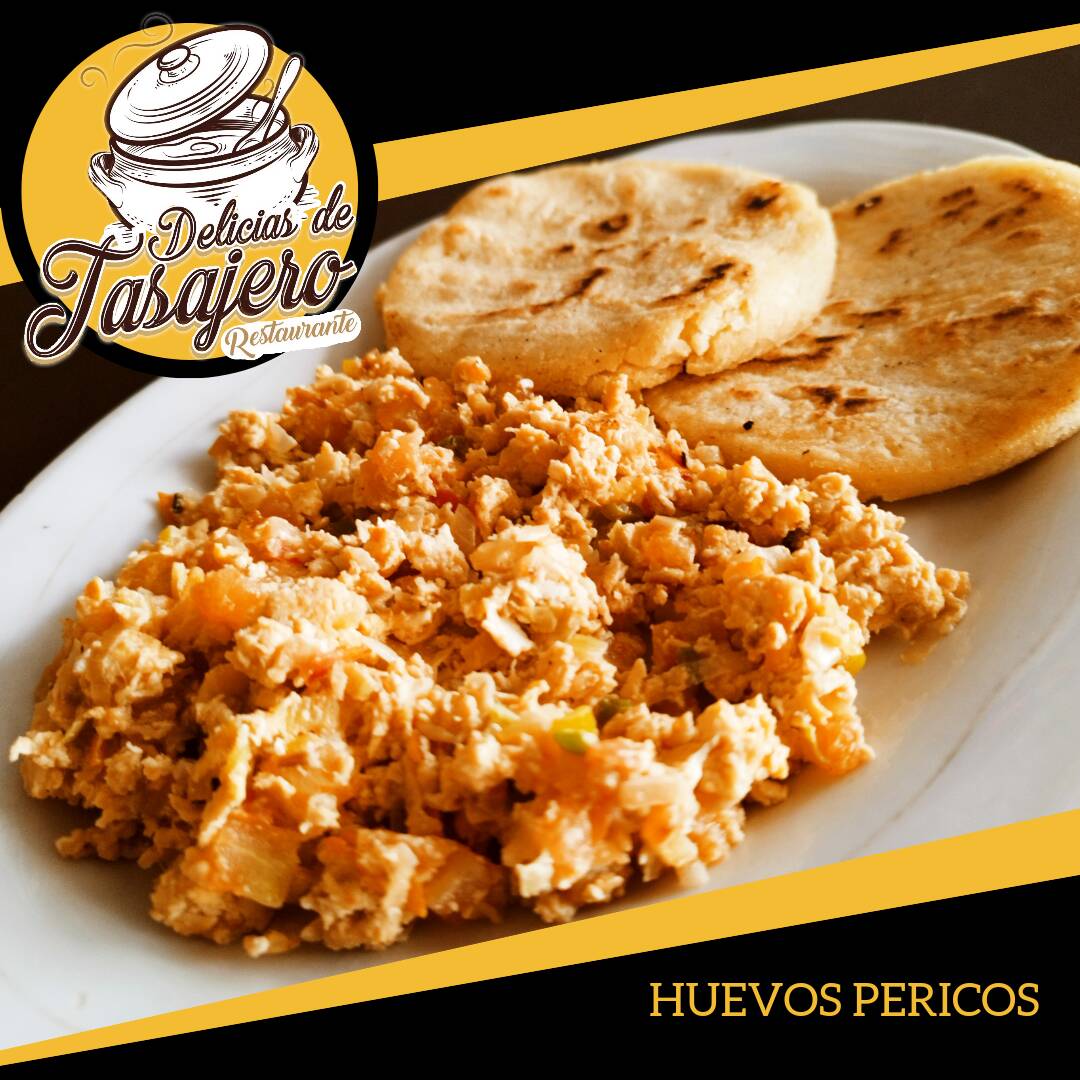 Huevos revueltos con tomate y cebolla acompañados con 2 arepas y café con leche