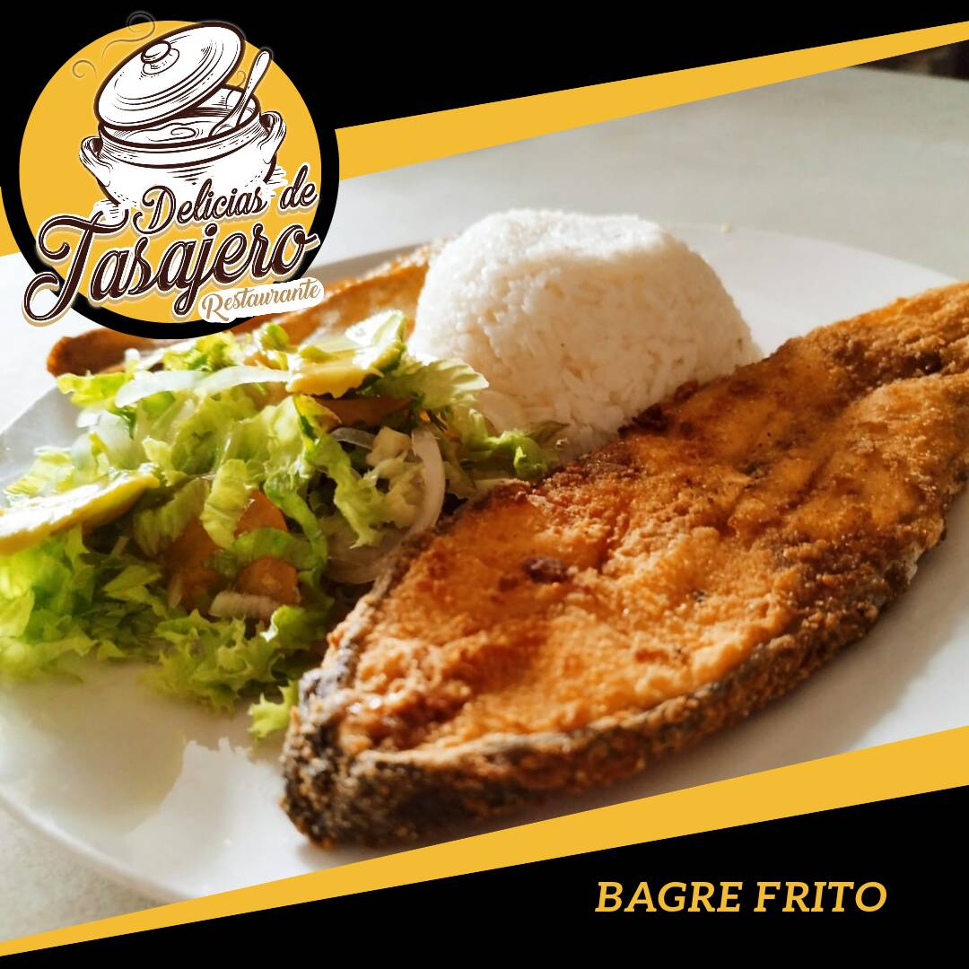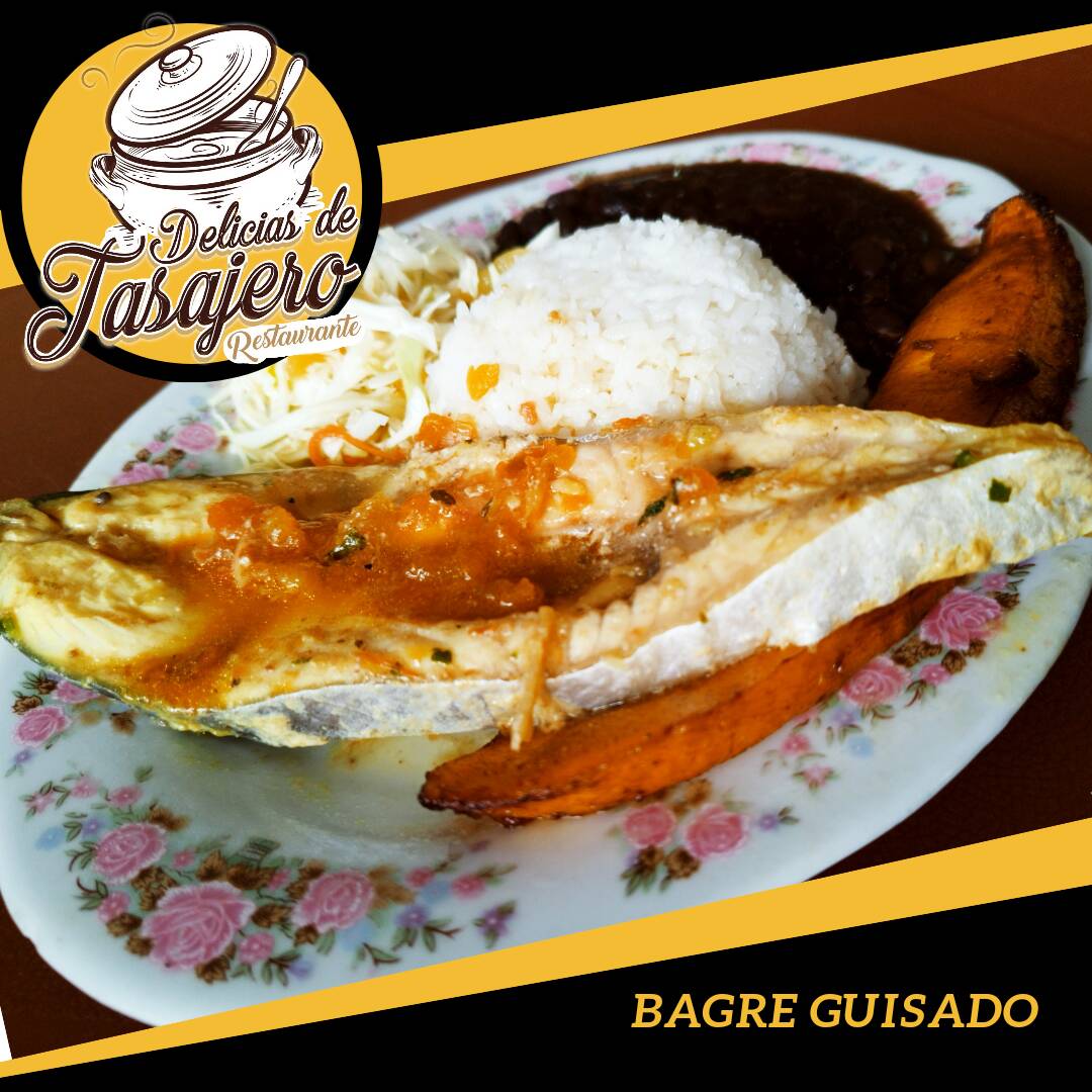 Bagre guisado, principio, arroz, cocido, ensalada, sopa.