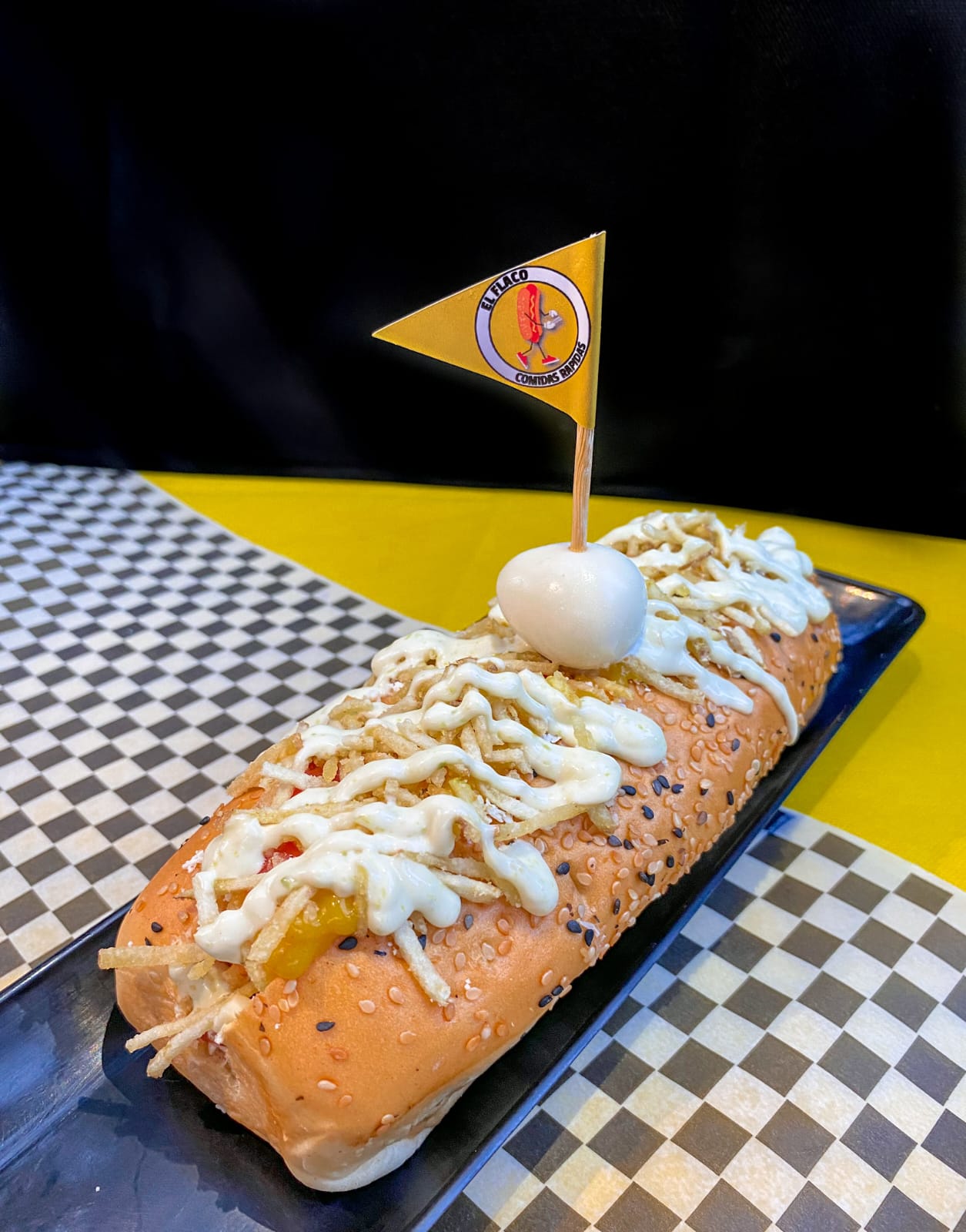 Pan, salchicha ranchera,cebolla, queso rayado, papa molida, queso crema, huevo de codorniz y salsas ( Tártara, Piña, Mostaza y Tomate)