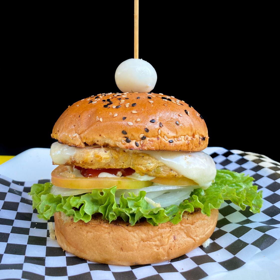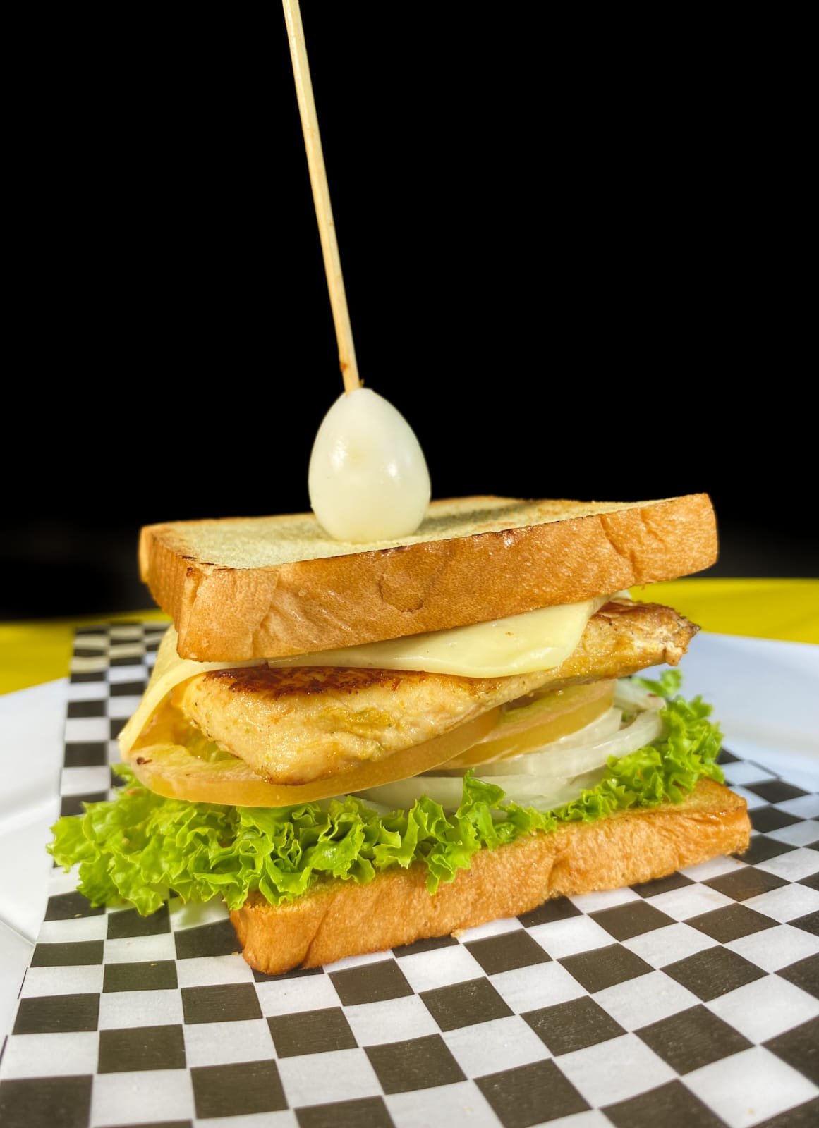 Pan, filete de pechuga x2, lechuga, cebolla, tomate, queso crema, huevo de codorniz, salsa de tomate y tártara.