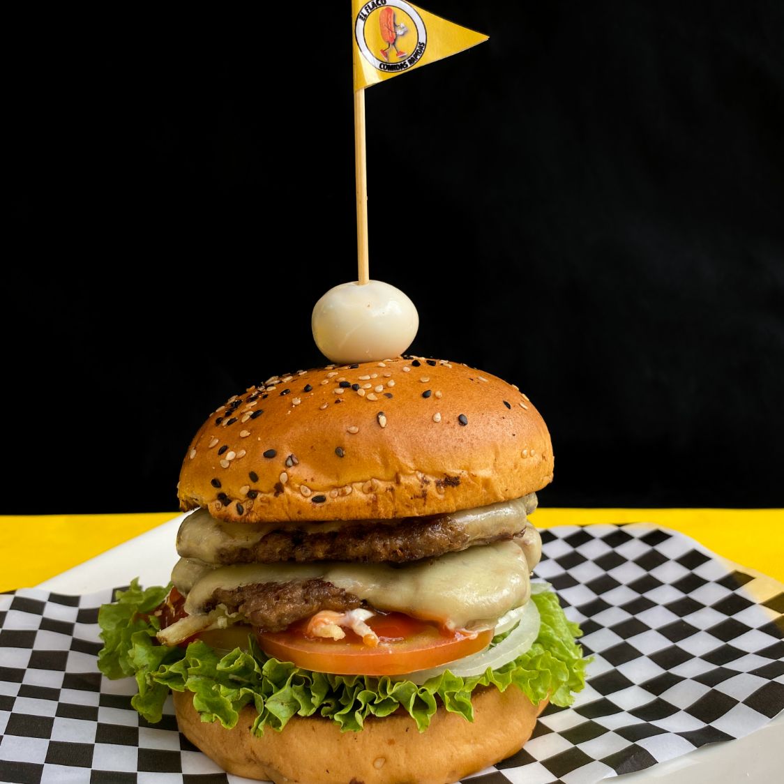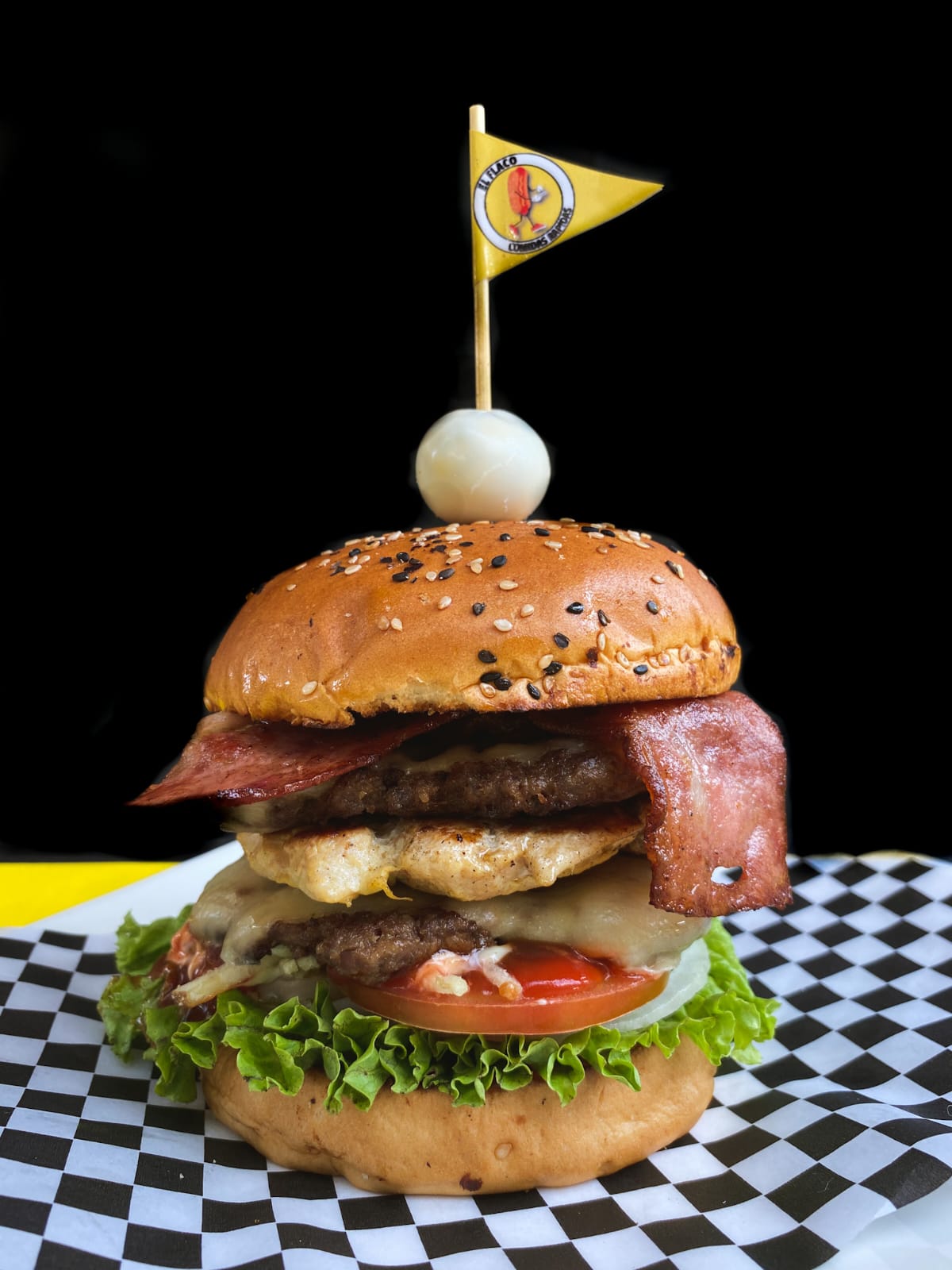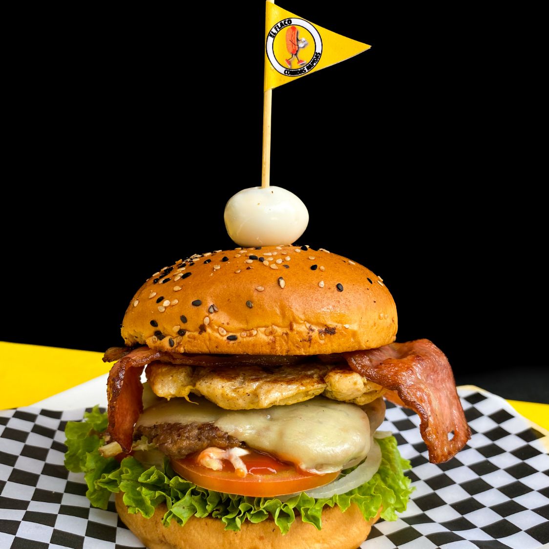 Pan, doble croqueta de carne, filete y tocineta , lechuga, cebolla, tomate, papa molida, queso crema, huevo de codorniz, salsa de tomate, tártara y BBQ.