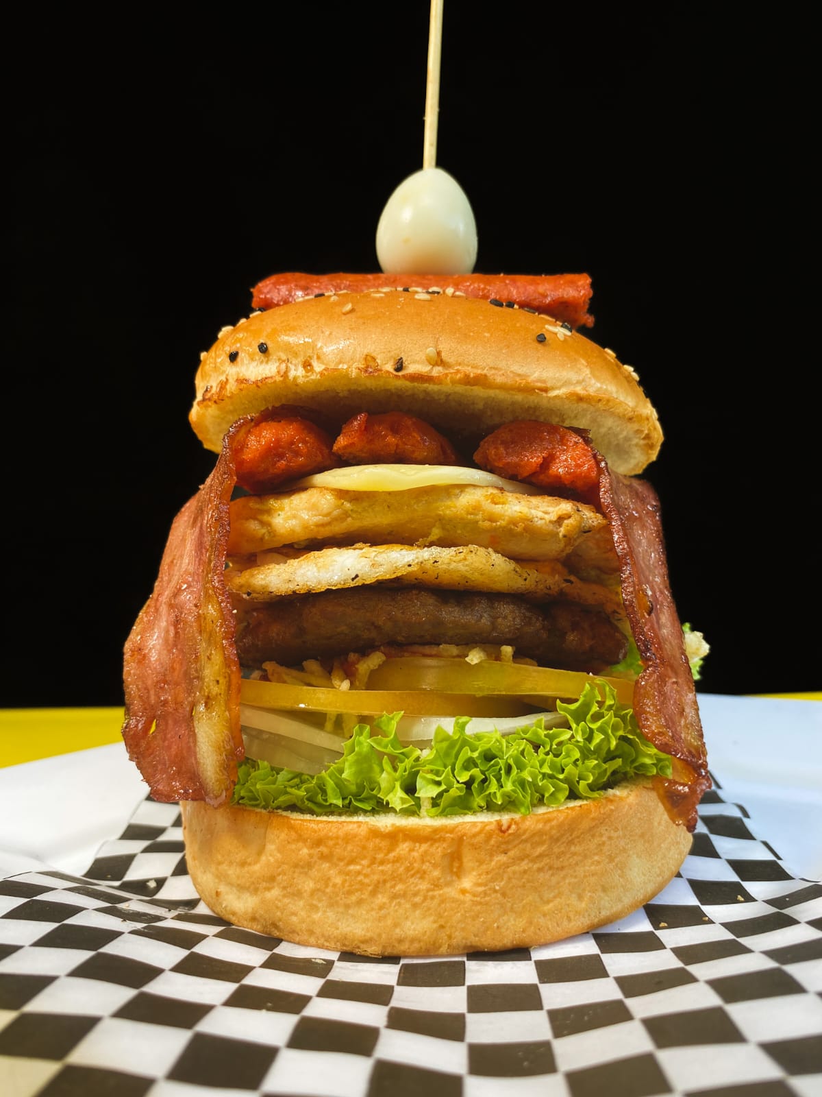 Pan, croqueta de carne, filete de pechuga, tocineta, huevo frito y chorizo mixto, lechuga, cebolla, tomate, papa molida, queso crema, huevo de codorniz, salsa de tomate, tártara y BBQ.