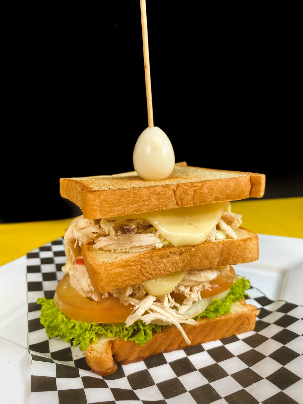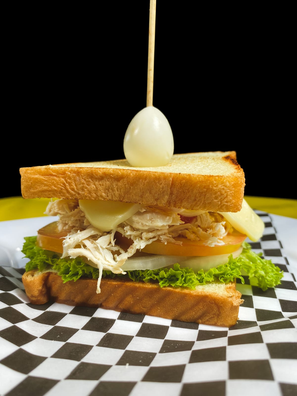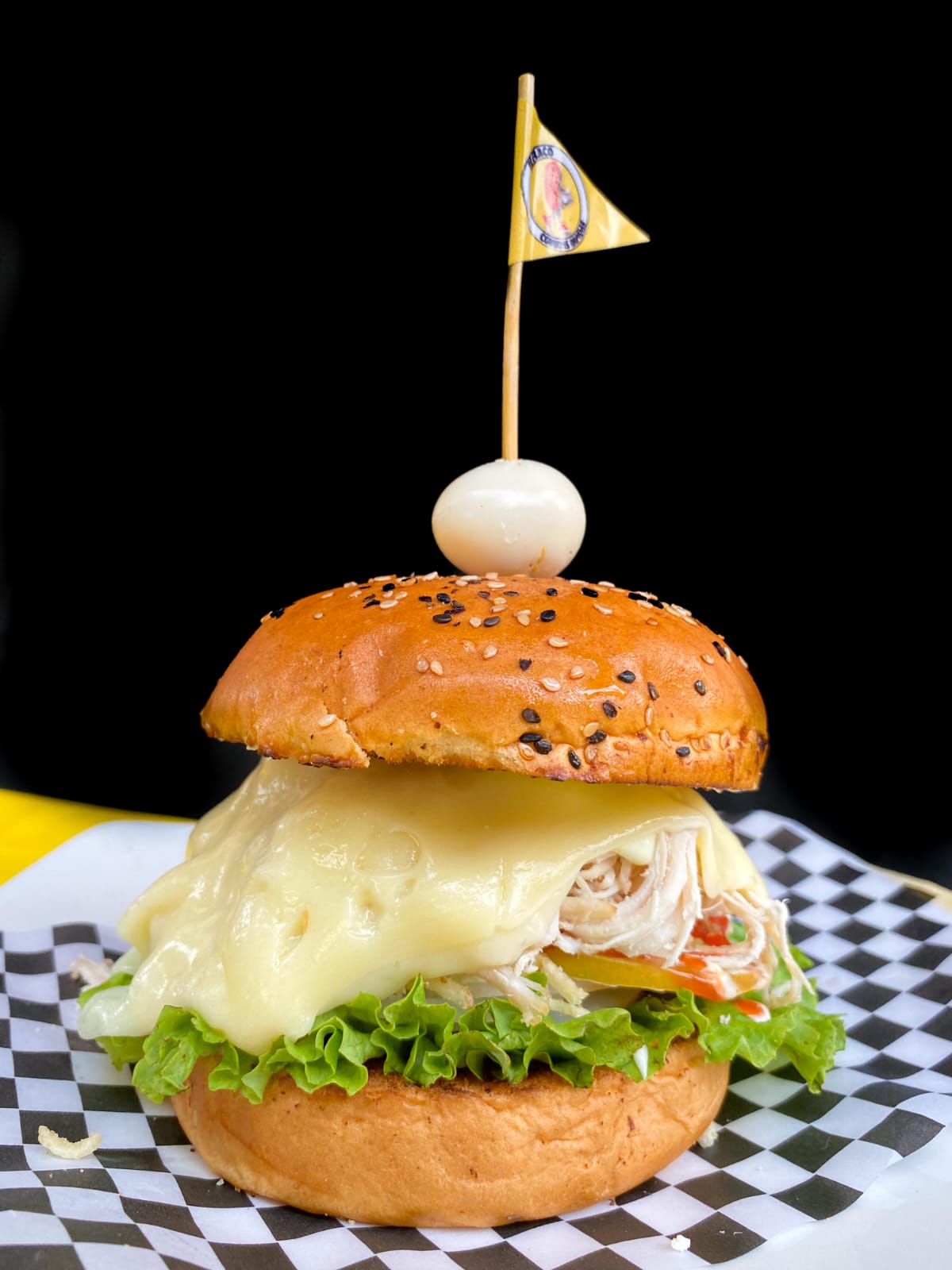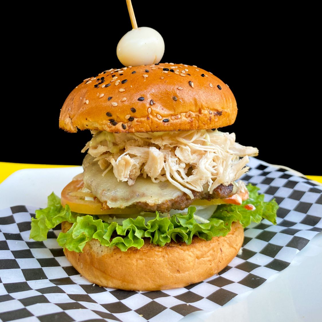 Pan, pollo desmechado x2, lechuga, cebolla, tomate, queso crema, huevo de codorniz, salsa de tomate y tártara.