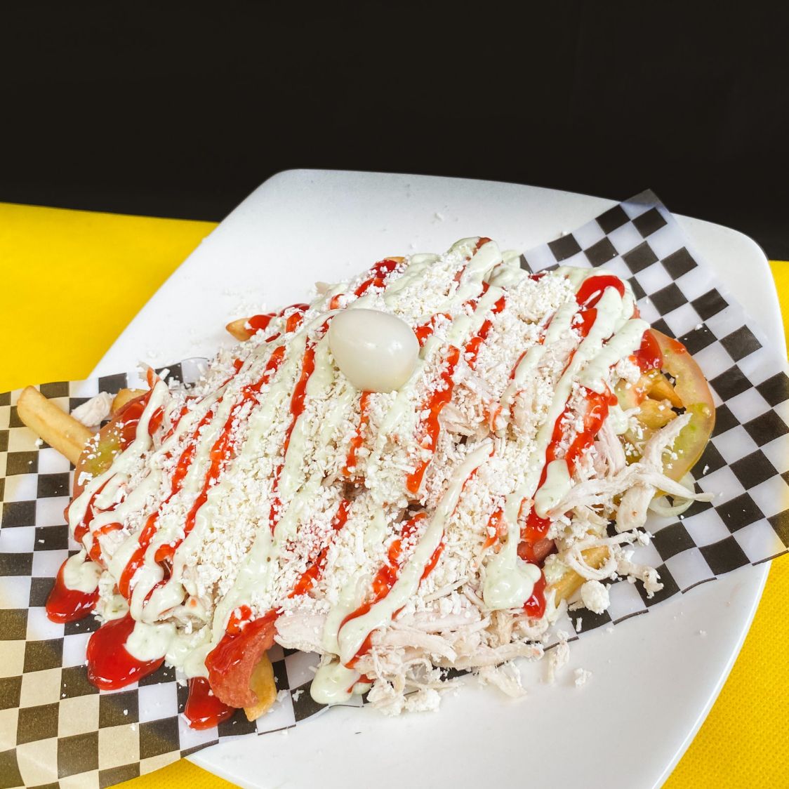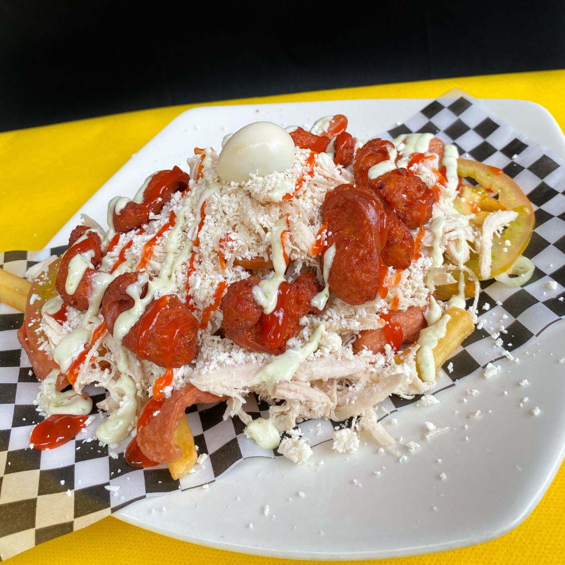 Papas a la francesa, chorizo mixto, pollo desmechado, cebolla, tomate, queso rayado, huevo de codorniz, salsa de tomate y tártara.