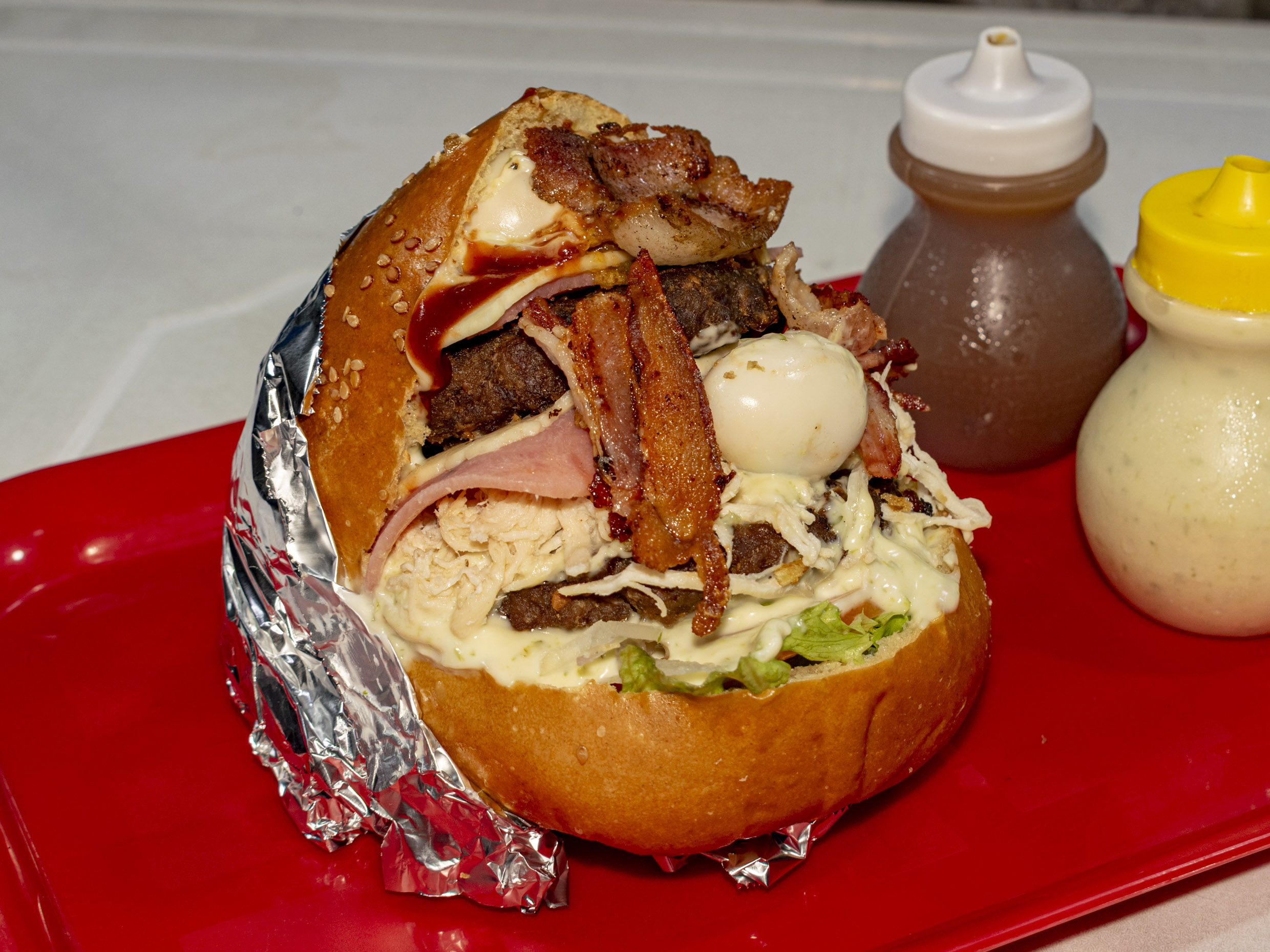 Doble carne, doble pollo, doble jamón, doble queso, tocineta, lechuga, cebolla, tomate, papita desmenuzada, piña, tártara, salsa de tomate y 3 huevos de codorniz.