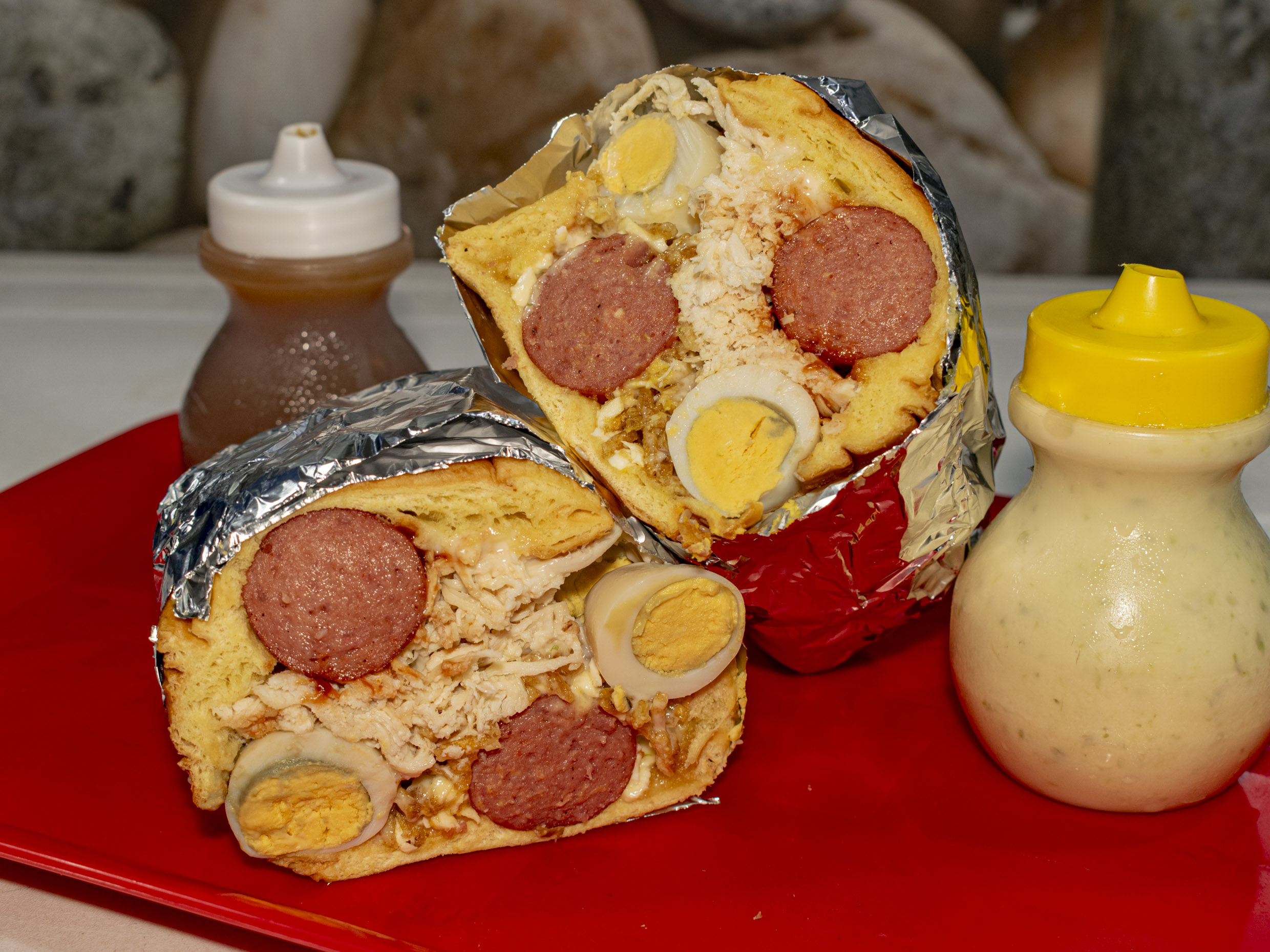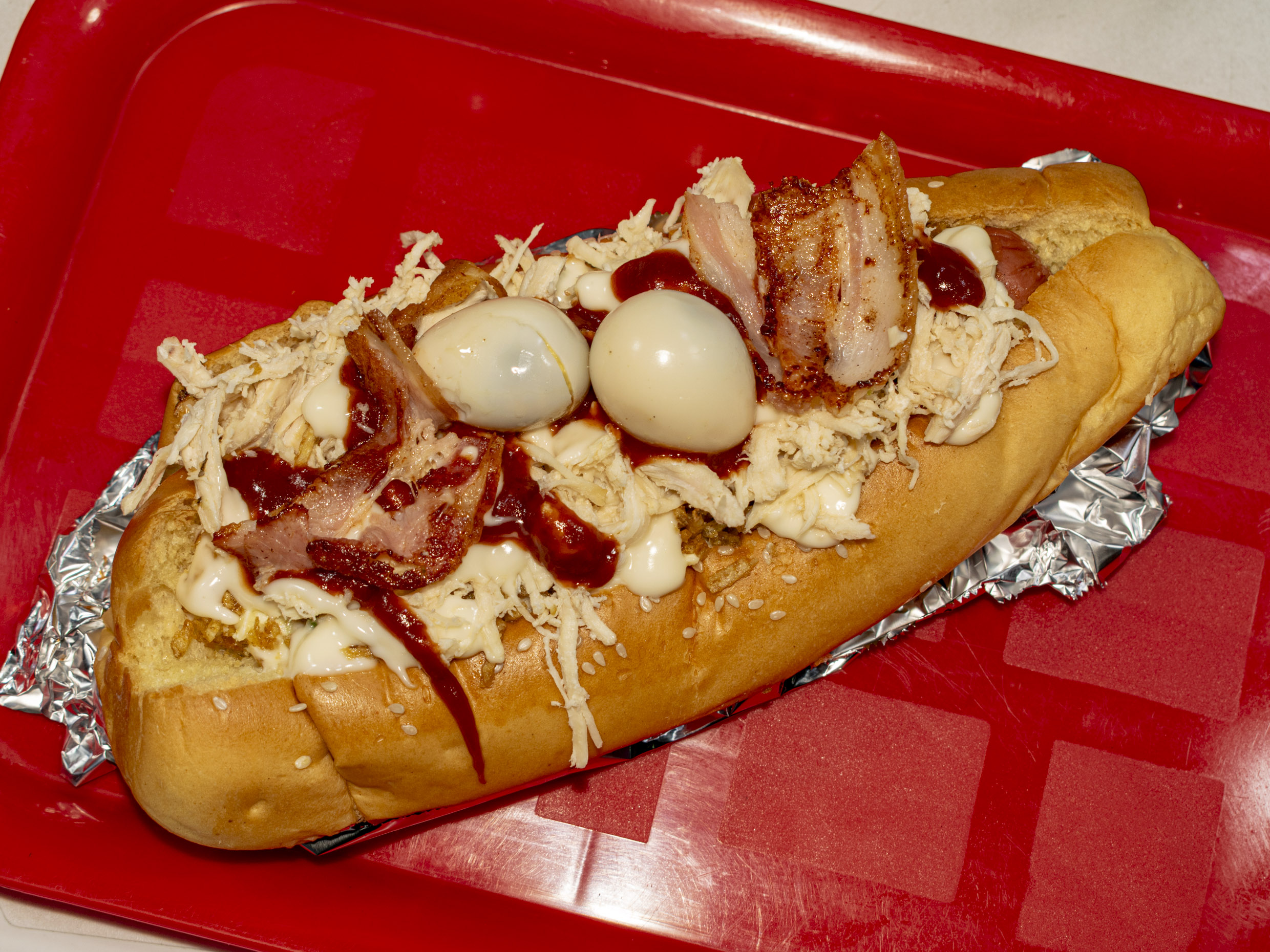 Doble salchica, doble pan, pollo, cebolla, papita, queso, piña, tártara, tocineta, salsa de tomate, y huevo de codorniz.