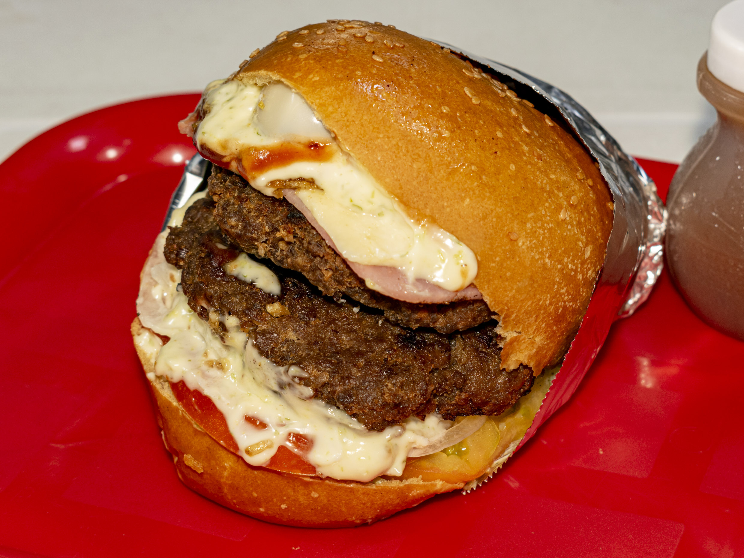 Hamburguesa con doble carne y pollo, tocineta, lechuga, cebolla, tomate, doble
