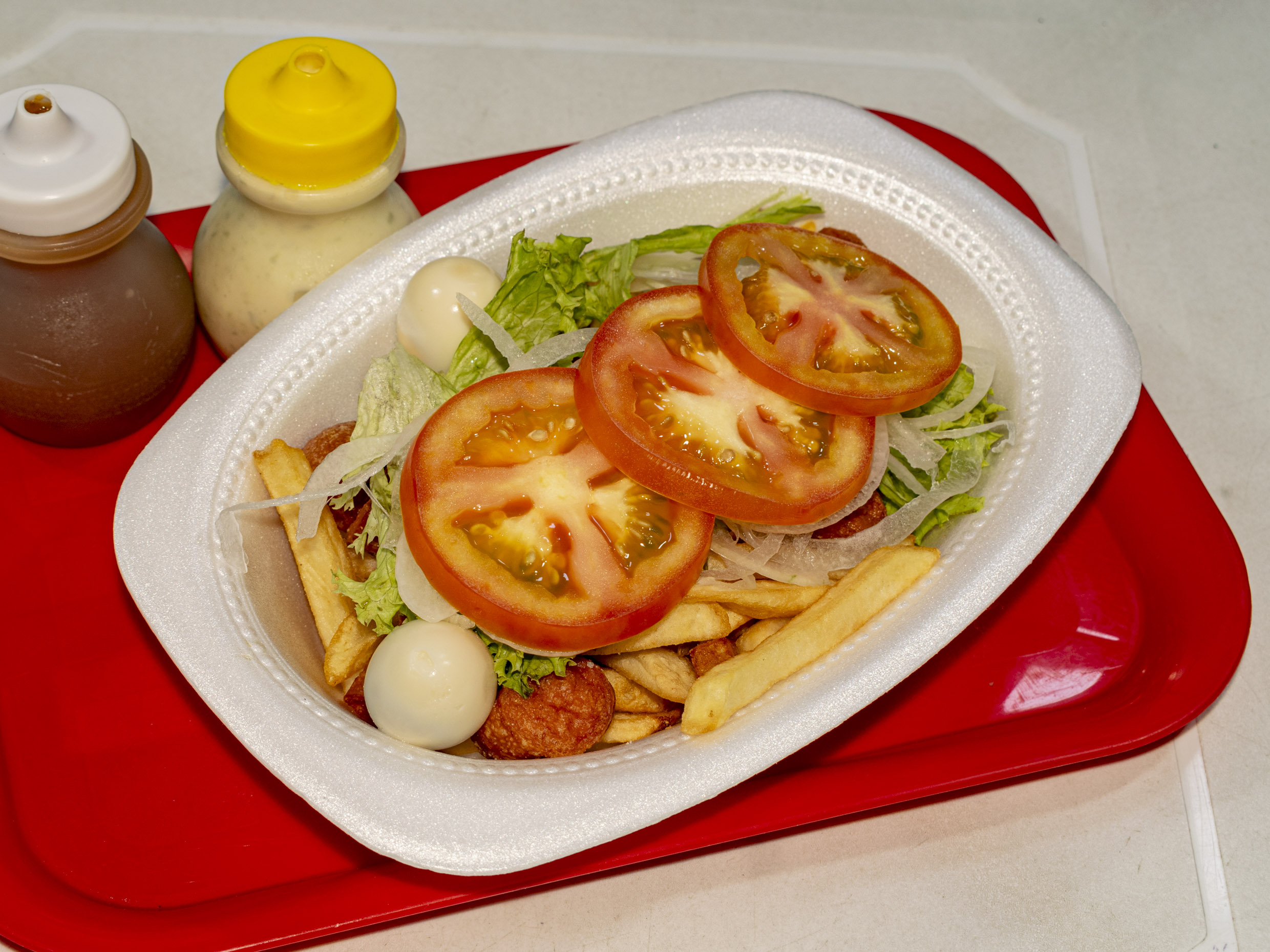 Salchichas, papa a la francesa, lechuga, cebolla, huevo de codorniz, tomate y salsas.