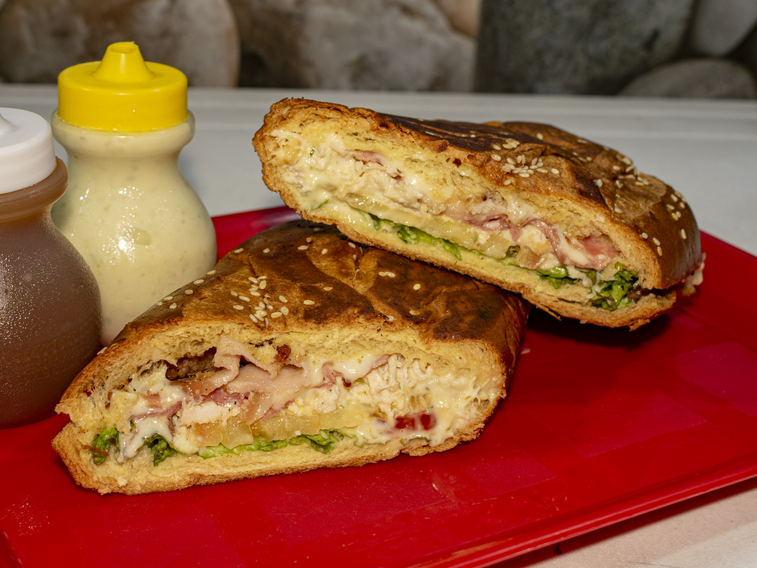 Jamón, queso, pollo, lechuga, tomate, tártara y mostaza.