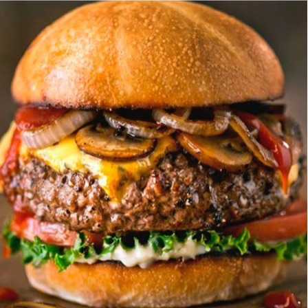 Pan brioche, vegetales, cebolla grille, carne, jamón, queso, huevo frito, salsas.