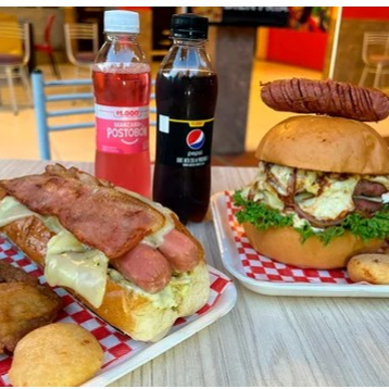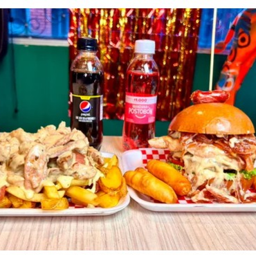 Perro caliente con pan brioche, doble salchicha, papita de perro, queso fundido, tocineta, porción de alitas 2 unidades. Hamburguesa con pan brioche, doble carne, doble queso, cebolla grille, salchicha picada, lechuga, tomate, chorizo, porción de alitas 2 unidades y 2 bebidas a elegir 250 ml.