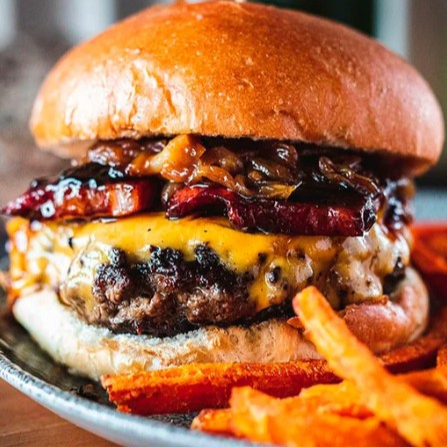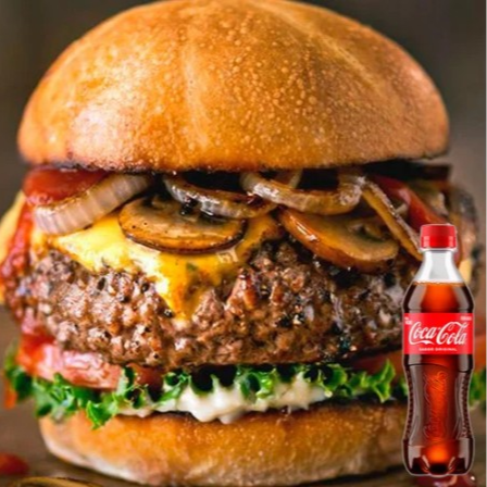 Pan brioche, vegetales de temporada, cebolla grillé, carne, jamón, queso, huevo frito y salsas de la casa. + Gaseosa Pet 250 ( sabor a disponibilidad de la tienda )