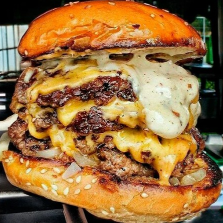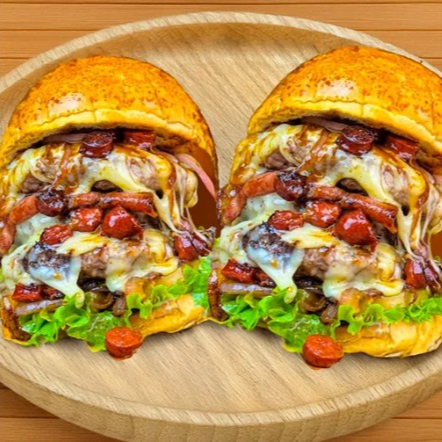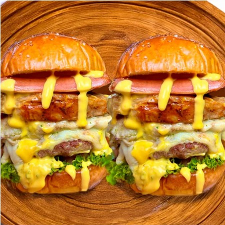 Dos hamburguesas triple carne, triple queso, cebolla grillé, salchicha picada, lechuga, tomate, tártara y bbq de la casa.
