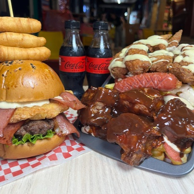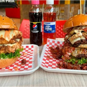 Dos hamburguesas con pan brioche, croqueta de carne, queso, lomo de cerdo, pechuga a la plancha, lechuga, tomate, salsa cheddar y un chorizo criollo.