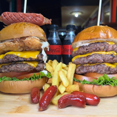 1 hamburguesa especial con pan brioche, triple croqueta de carne, triple queso mozarella y salsa de la casa. 1 hamburguesa especial con pan brioche, lechuga, tomate, doble croqueta de carne, doble queso mozzarella, filete de pechuga y chorizo criollo. 1 porcion de paps fritas. 5 chorizos cocteleros. 2 gaseosas pet 400 ml.