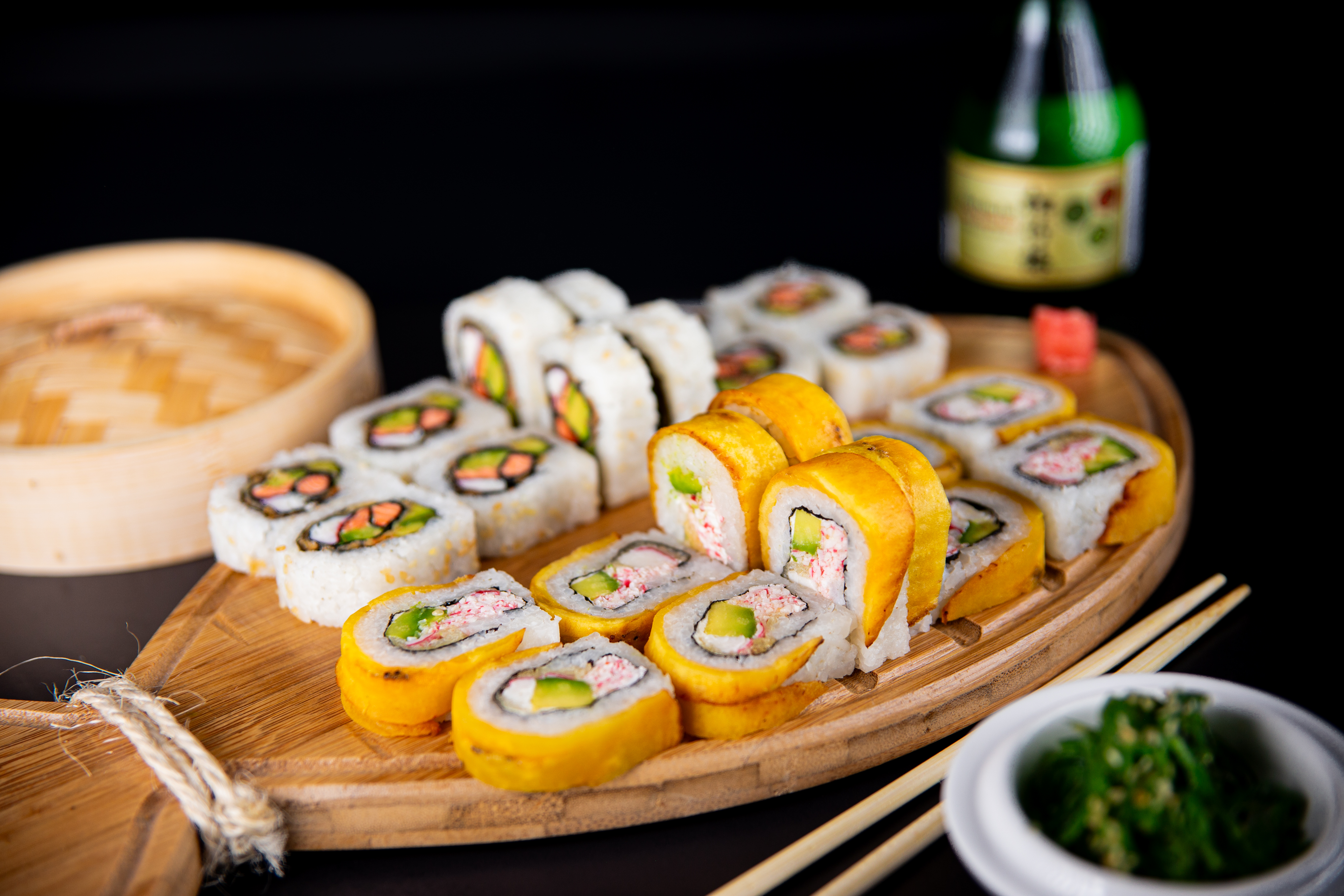 Roll Pasta de palmito en tempura, plátano maduro, toping de aguacate.