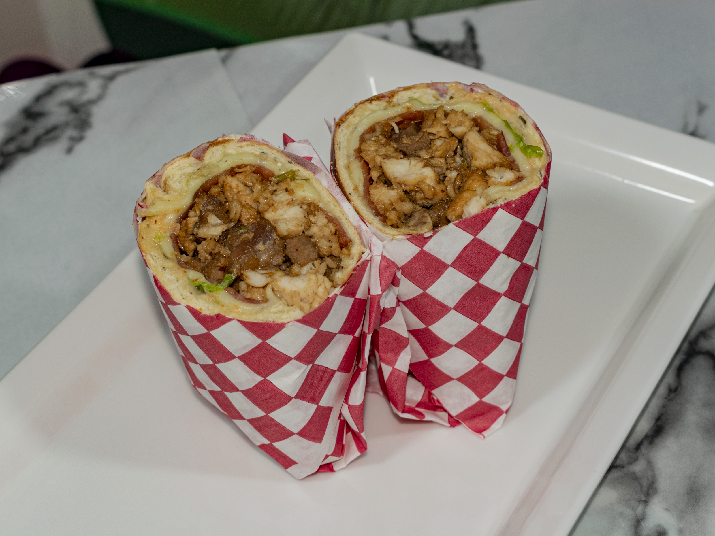 Pan de orégano, pechuga de pollo, carne asada en julianas, lechuga, jamón ahumado, queso paisa o mozzarella.