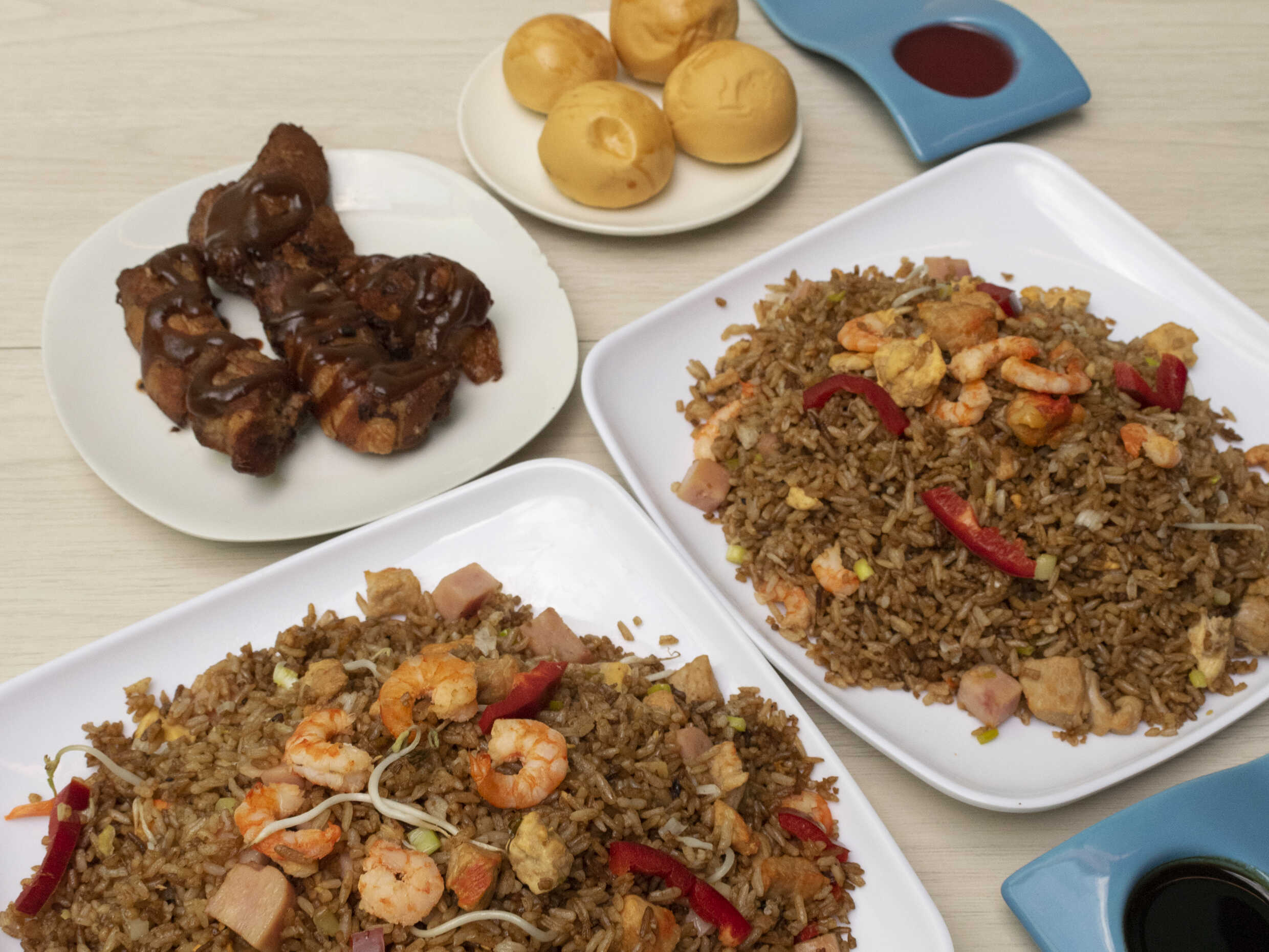 Arroz chino con pollo, Carne, jamón, camarones, cebollín , pimentón y raíces chinas + costillas de cerdo+ papas fritas y gaseosa 1.5 L. a disponibilidad.
