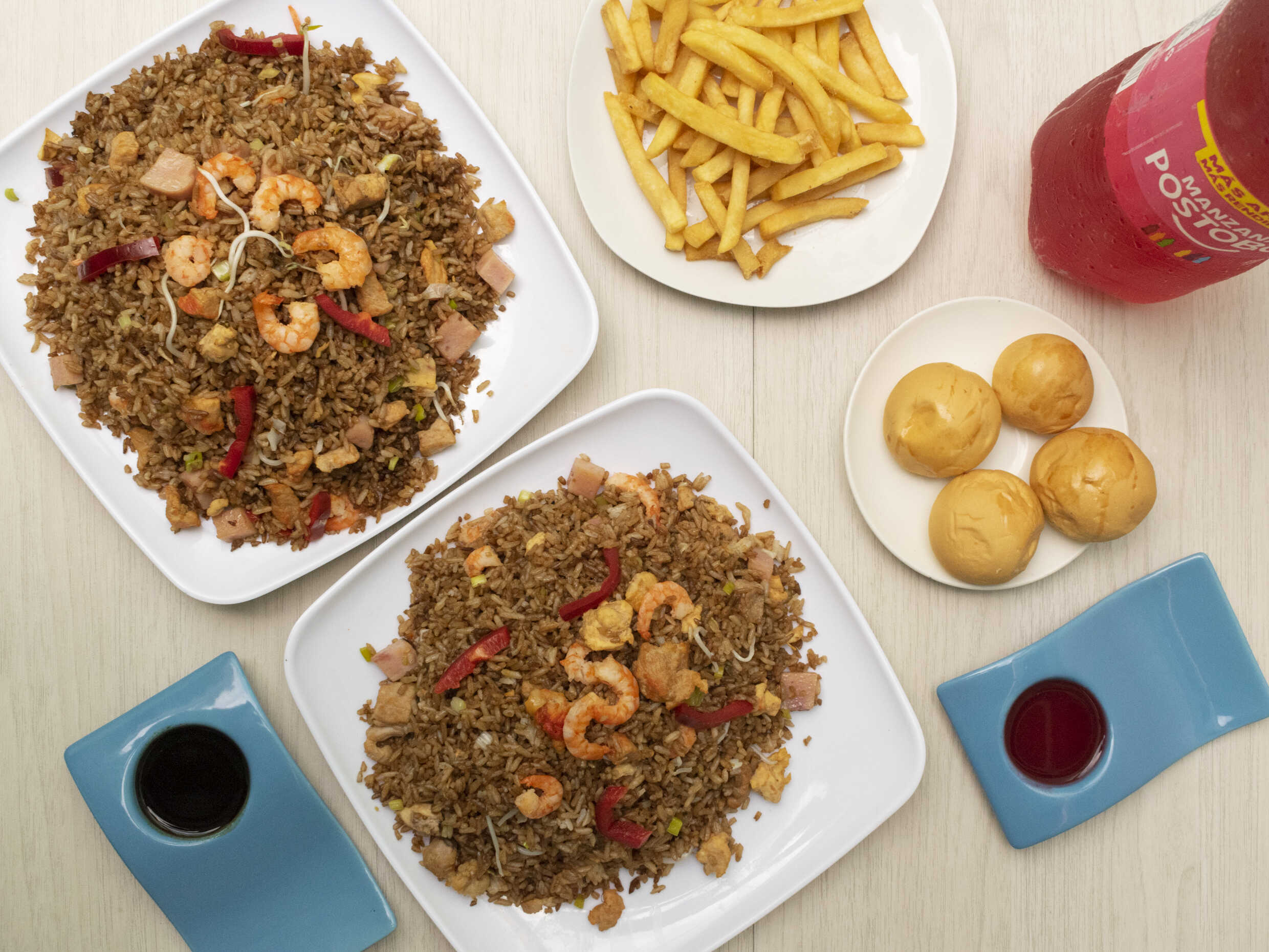 Arroz chino con pollo, Carne, jamón, camarones, cebollín , pimentón y raices chinas + papas fritas + gaseosa 1.5 L. a disponibilidad.