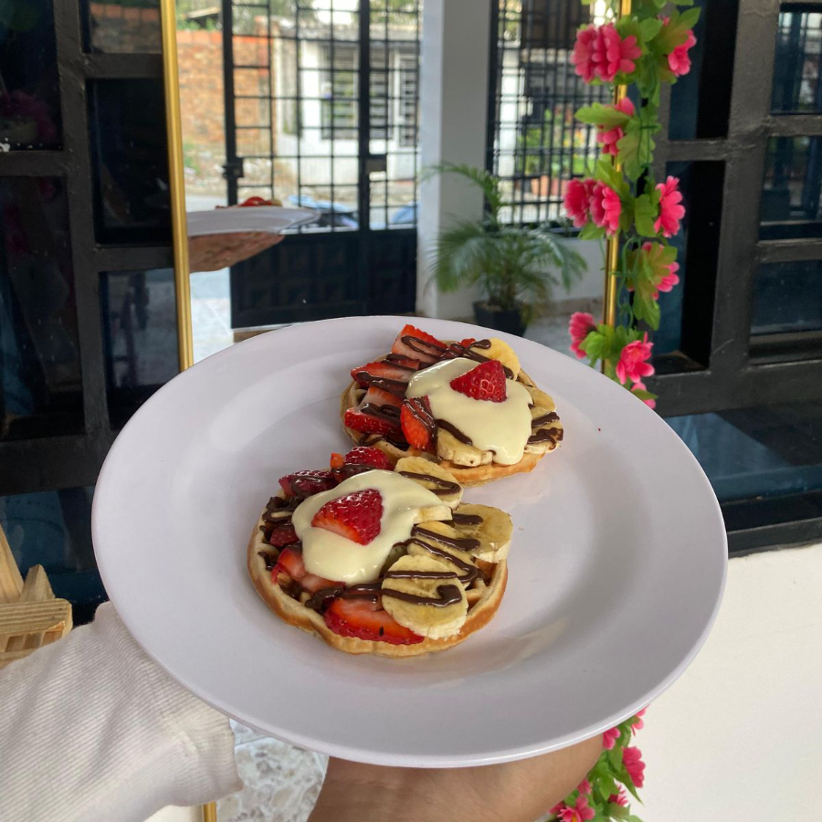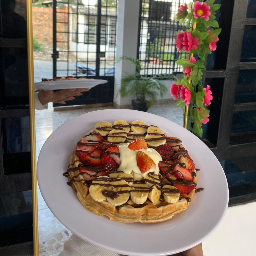 Waffle grande recién preparado, acompañado de banano en rodajas, fresas frescas y nuestra crema de la casa, suave y deliciosa. Una opción perfecta para los más antojados y amantes de lo dulce
