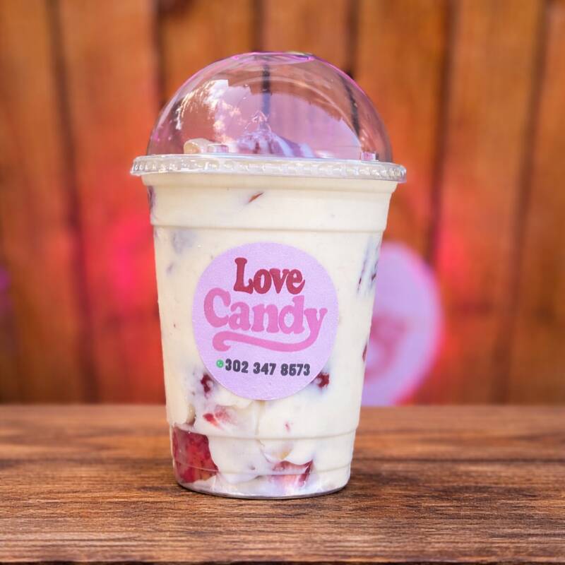 Vaso de 7 onzas con fresas frescas, crema y leche condensada. Clásicas, dulces y deliciosas.