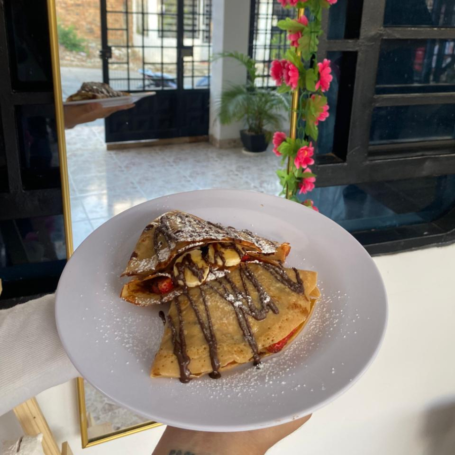 2 Crepe recién hechos rellenos de banano, fresa y chocolate. Dulce, suave y delicioso.