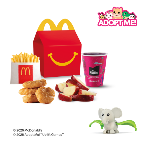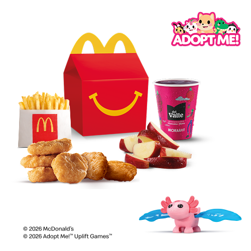 Elige tu Cajita Feliz™ con 4 piezas de nuggets 100% de pechuga de pollo apanadas con papas kids, jugo Del Valle Moraah, cascos de manzana y juguete.