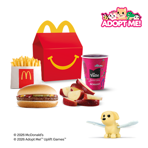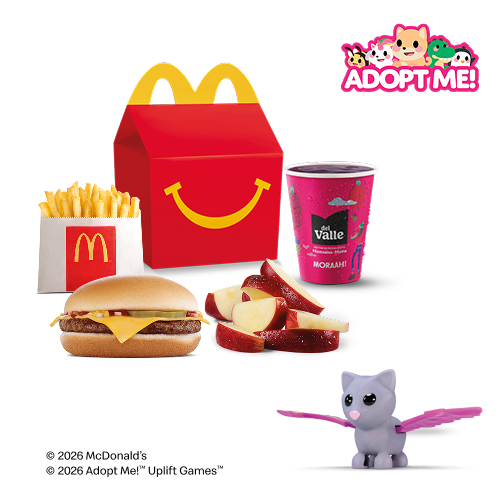 Elige tu Cajita Feliz™ con Hamburguesa Con Queso con carne 100% de res de 50gr, salsa de tomate, mostaza, cebolla triturada y pepinillos con papas kids, jugo Del Valle Moraah, cascos de manzana y juguete.
