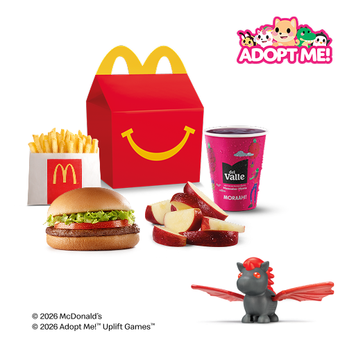 Elige tu Cajita Feliz™ con McFiesta Jr con carne 100% de res de 50gr, salsa de tomate, lechuga y tomate con papas kids, jugo Del Valle Moraah, cascos de manzana y juguete.