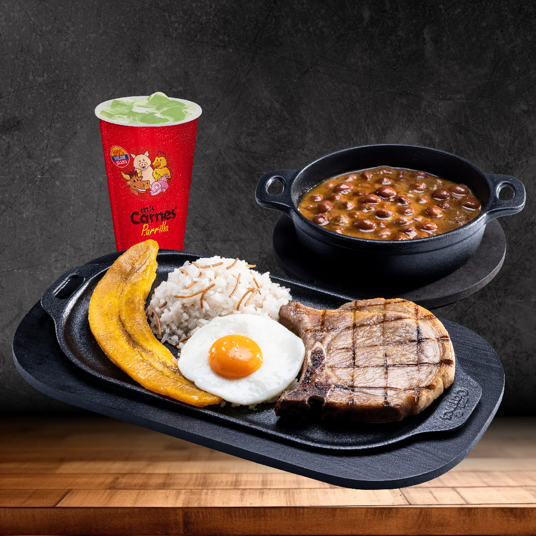 Chuleta a parrilla acompañado de tajada madura, huevo, arroz & sopa a elección.