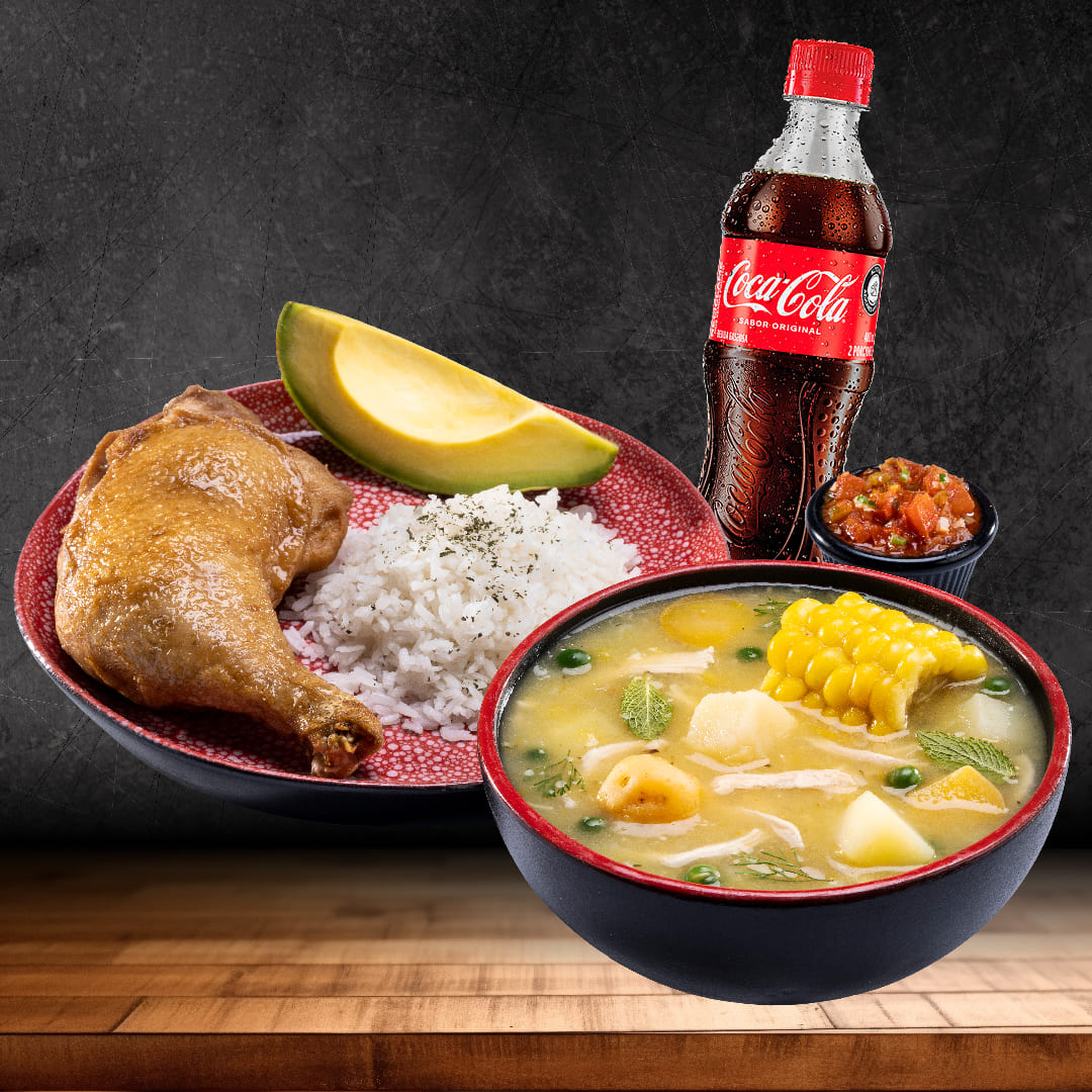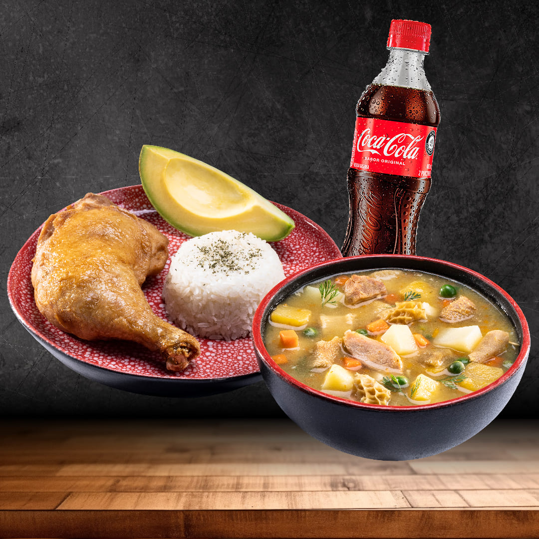 Carne de res, pechuga, costilla de cerdo bbq, morcilla, chorizo, arepa de queso, papa criolla, guacamole y Coca-Cola Original.