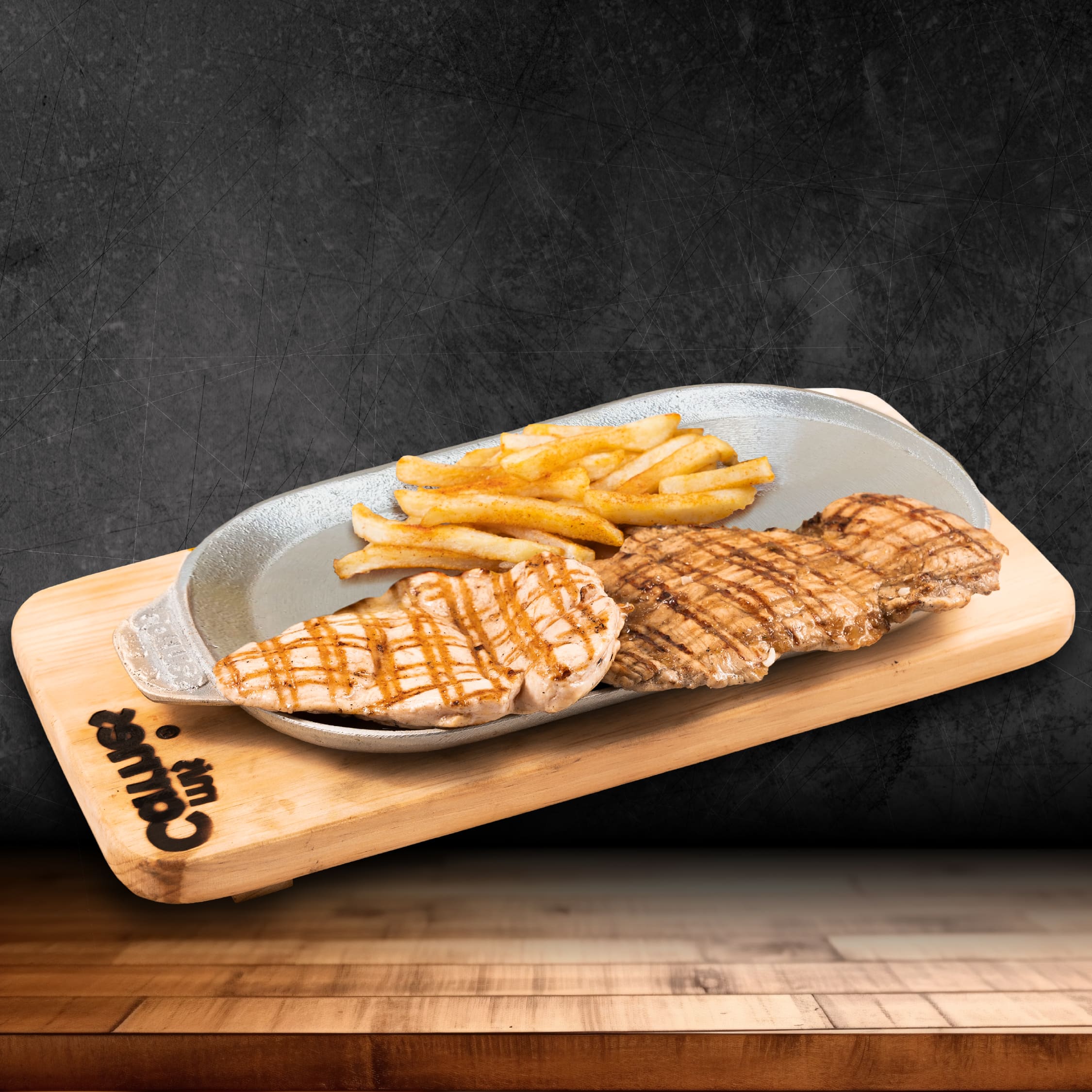 Dos deliciosas proteínas (Pechuga de pollo y Carne de Cerdo) acompañadas con papas a la francesa.