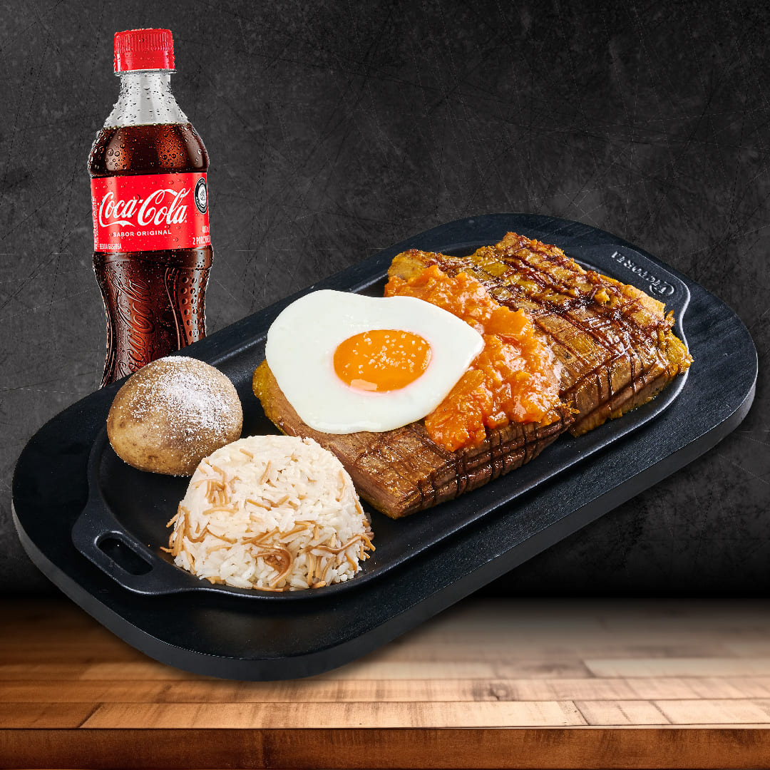 Elige 2 proteinas para tu plato y acompañalas con papa a la francesa, una porción de arroz blanco y una Coca Cola 400 ml.