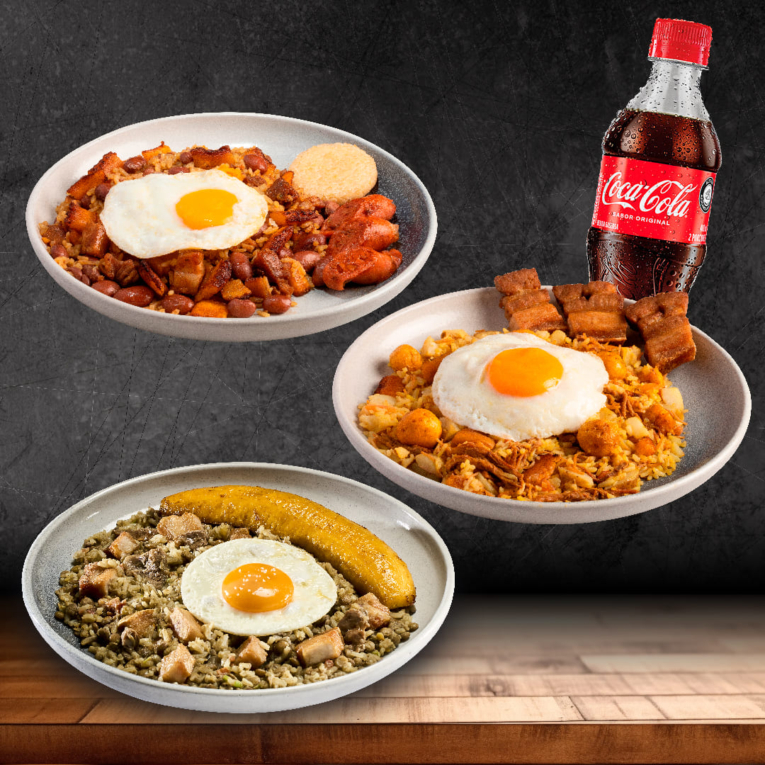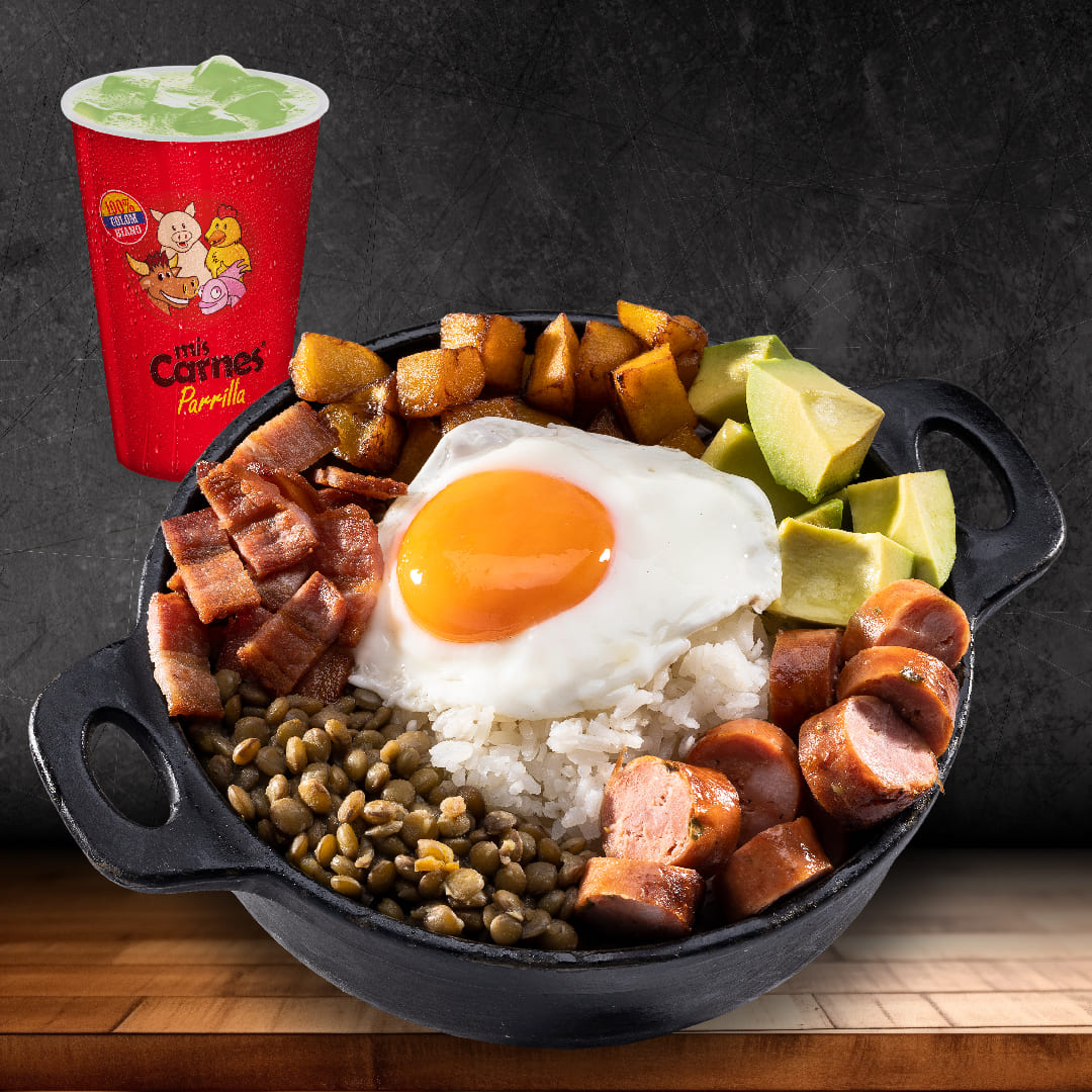Frijoles con arroz, chicharrón, chorizo, huevo frito, tajadas de plátano y aguacate! Nosotros te regalamos la Coca Cola.